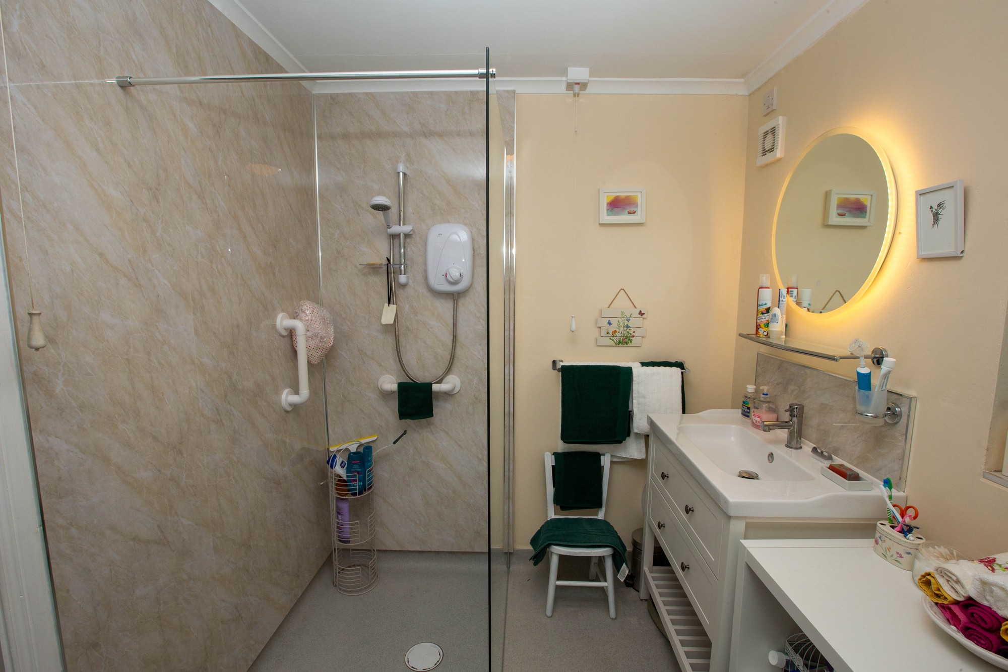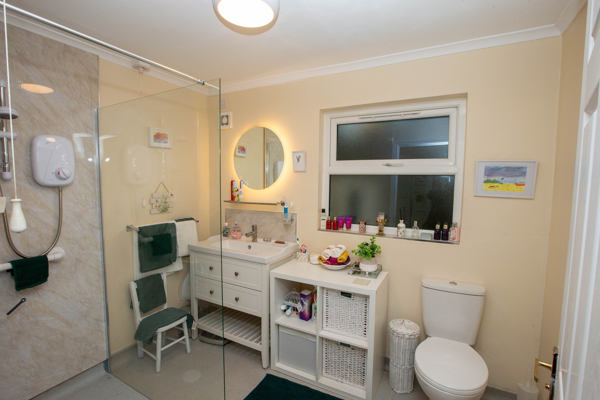 Bathroom Large shower enclosure, pedestal wash hand basin and wc.