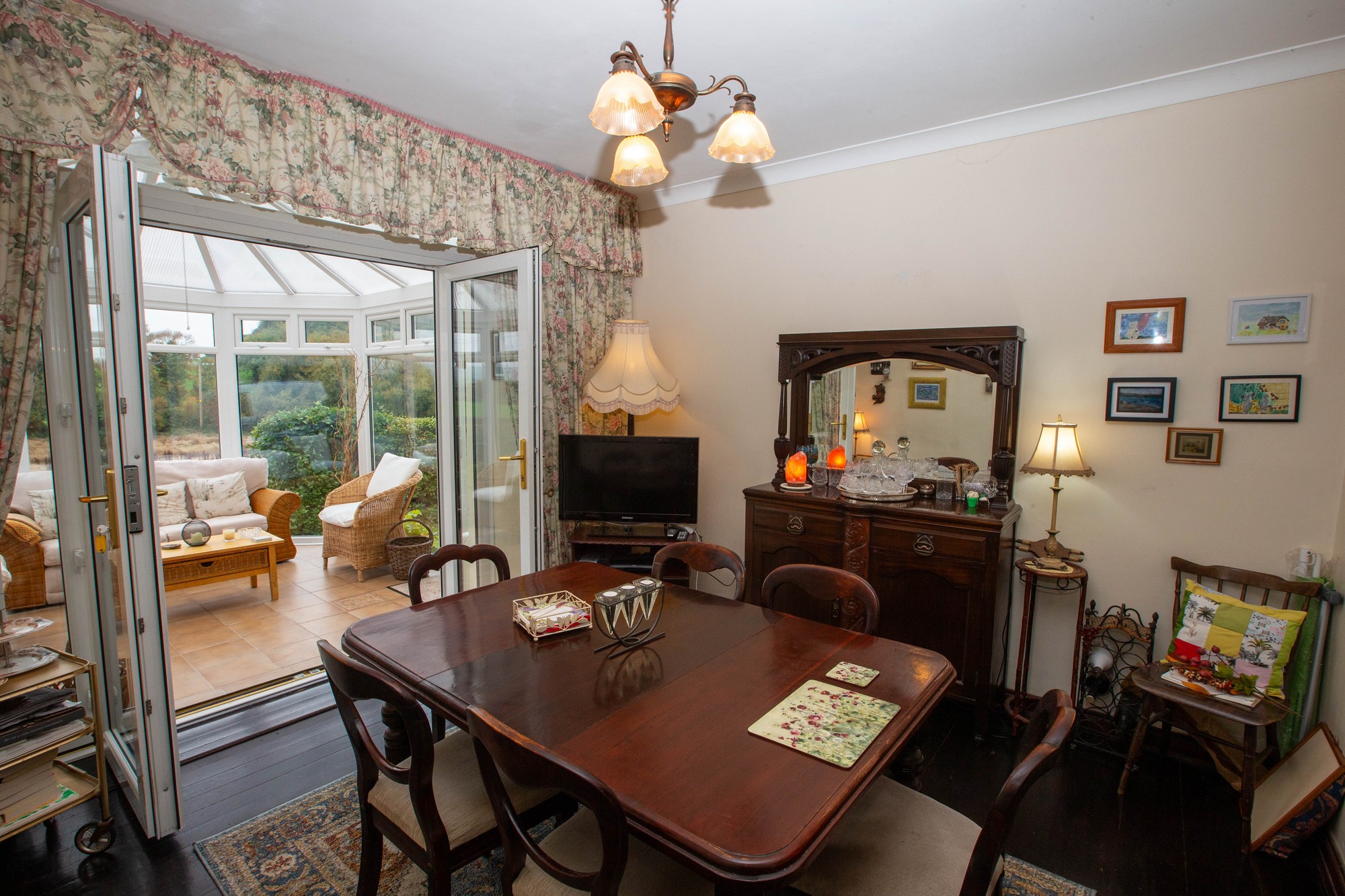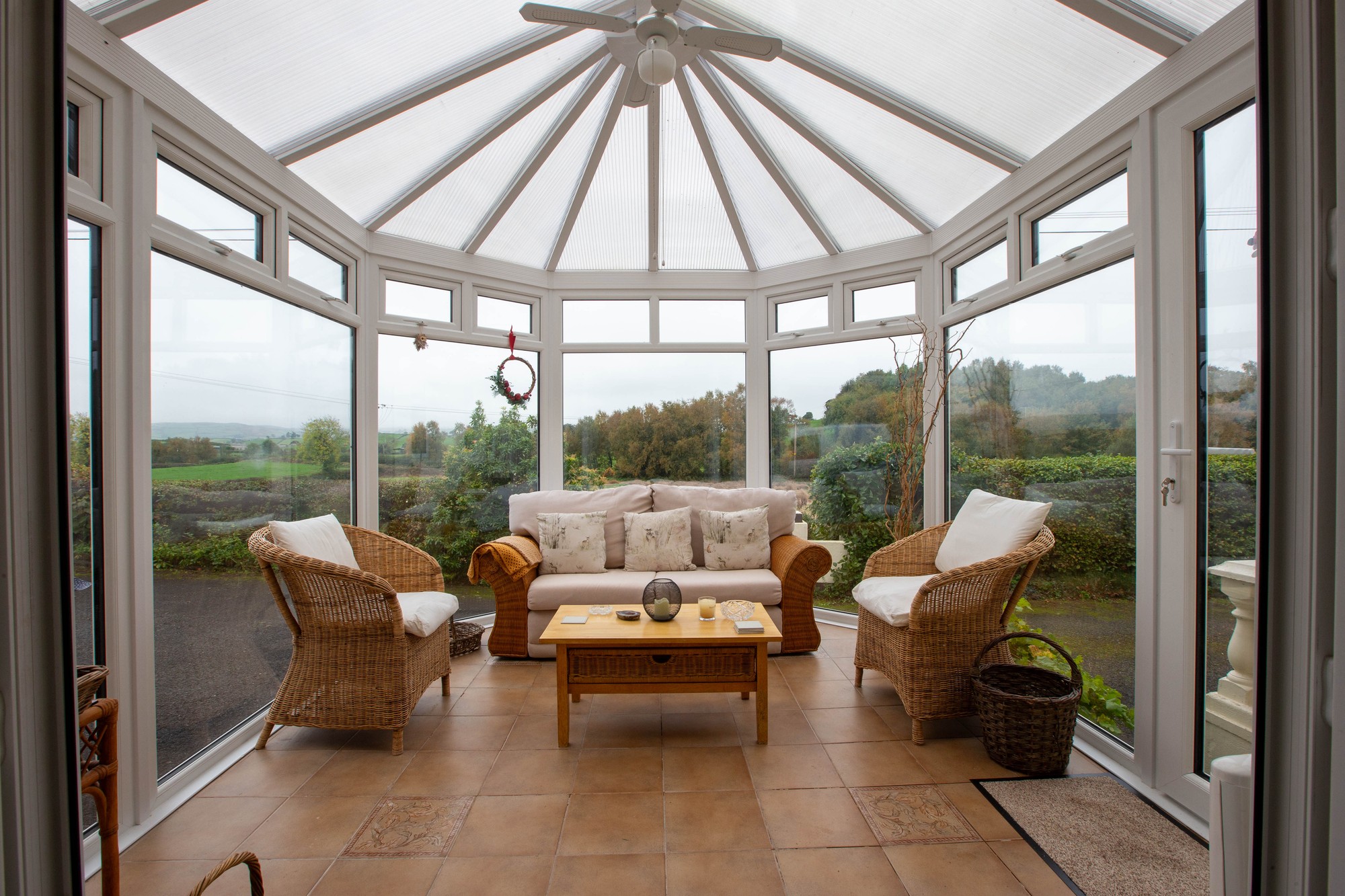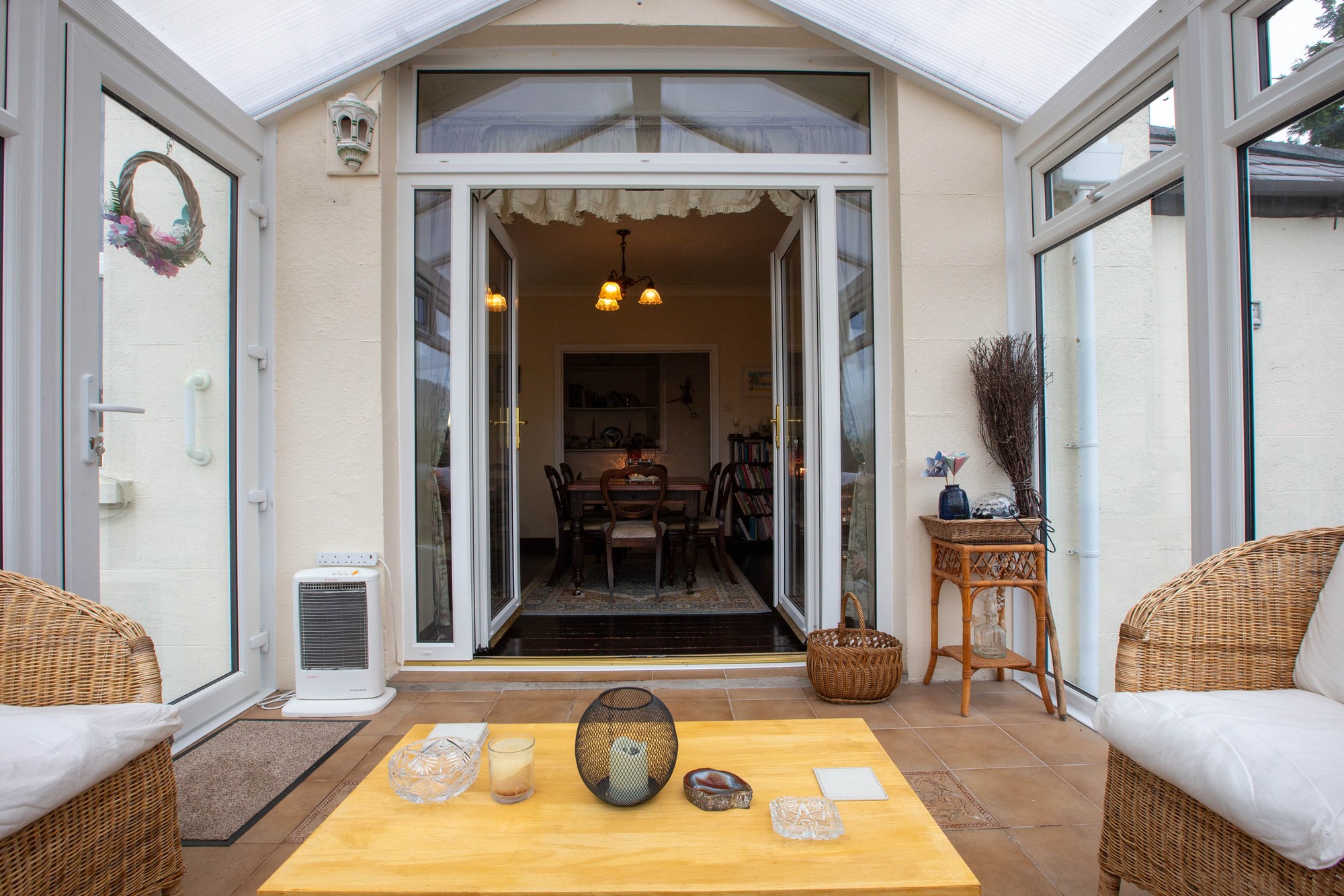 Entrance Sun Room 11’1” x 10’2” (3.38m x 3.1m) - PVC glazed door, tiled flooring, PVC glazed double doors to-