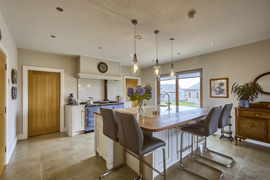 Luxury hand crafted kitchen by Drennans. Excellent range of units, Quartz worktops, oil fired four oven Aga, plumbed for American style fridge/freezer, island unit with breakfast area, vegetable sink, Franke Minerva tap (instant hot water tap), LED lighting.