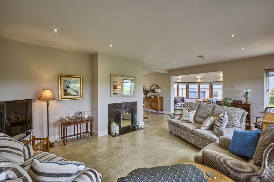 Ceramic tiled floor, hole in the wall fireplace, granite surround and hearth, electric fire, LED lighting, open plan to: