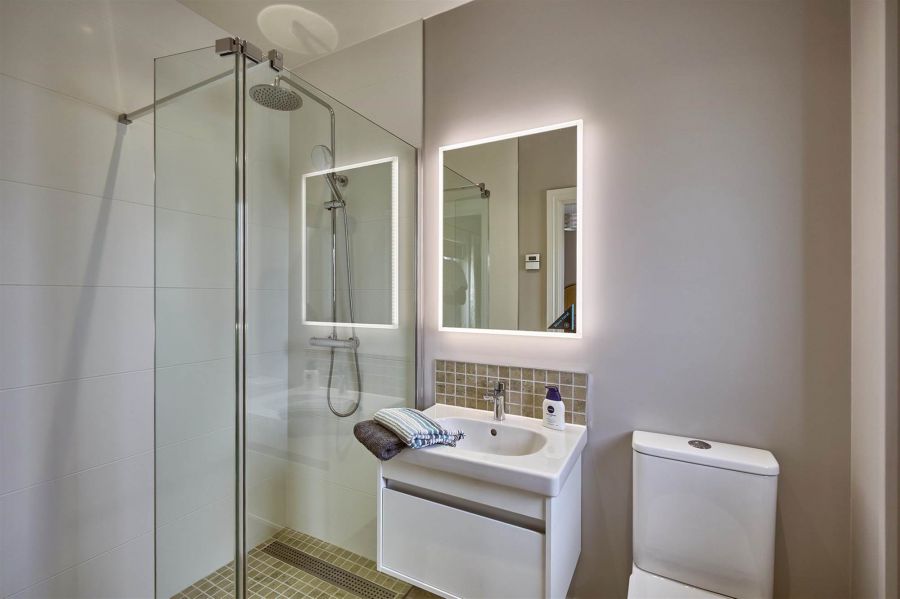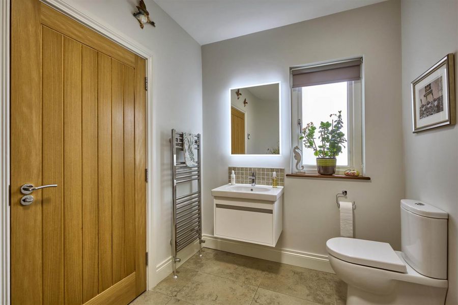 Heated towel rail, ceramic tiled floor, low flush wc, vanity unit, built-in cupboard with media wiring/controls for underfloor heating.