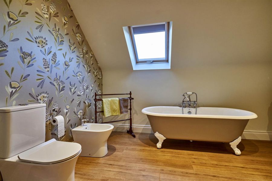 Ball and claw foot bath with mixer taps and telephone hand shower, vanity unit, bidet, low flush wc, walk-in double shower cubicle with rain shower head, bathroom mirror with integrated bluetooth speaker. Ceramic wood effect tiles. LED lighting, Velux window.