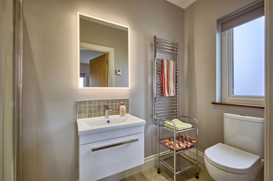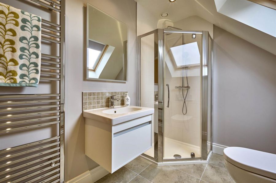 Fully tiled shower cubicle with thermostatic shower unit with rain head shower, low flush wc, heated towel rail, ceramic tiled floor. Velux window, LED lighting.