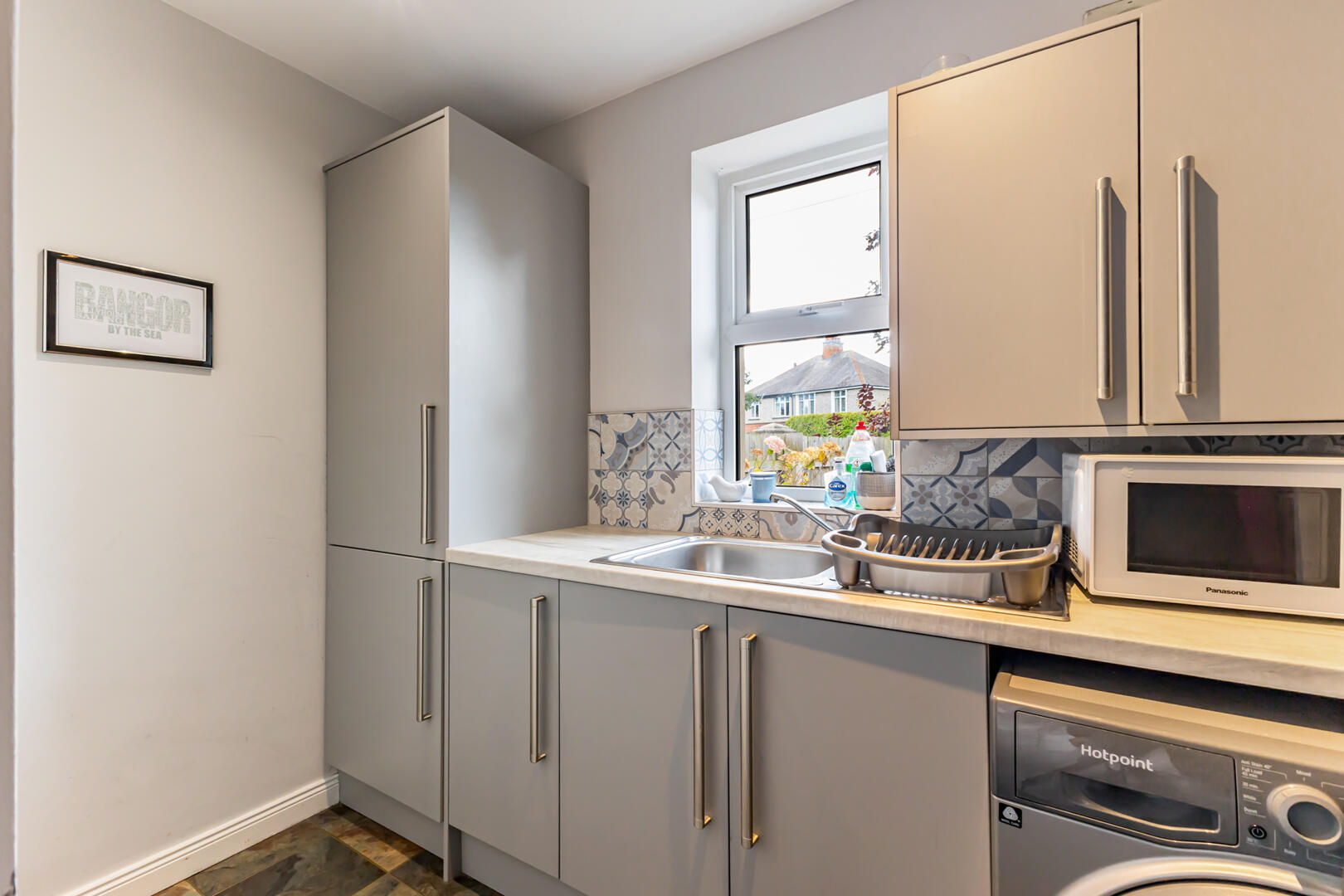 Storage cupboards, granite effect work surfaces, single bowl single drainer stainless steel sink unit, mixer tap, plumbed for washing machine, extractor fan, part tiled walls.
