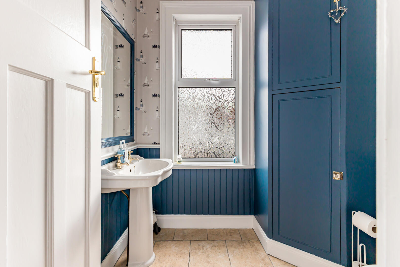 Two piece white suite comprising low flush WC, pedestal wash hand basin, fully tiled floor, part tongue and groove walls, storage under stairs, additional storage cupboard.