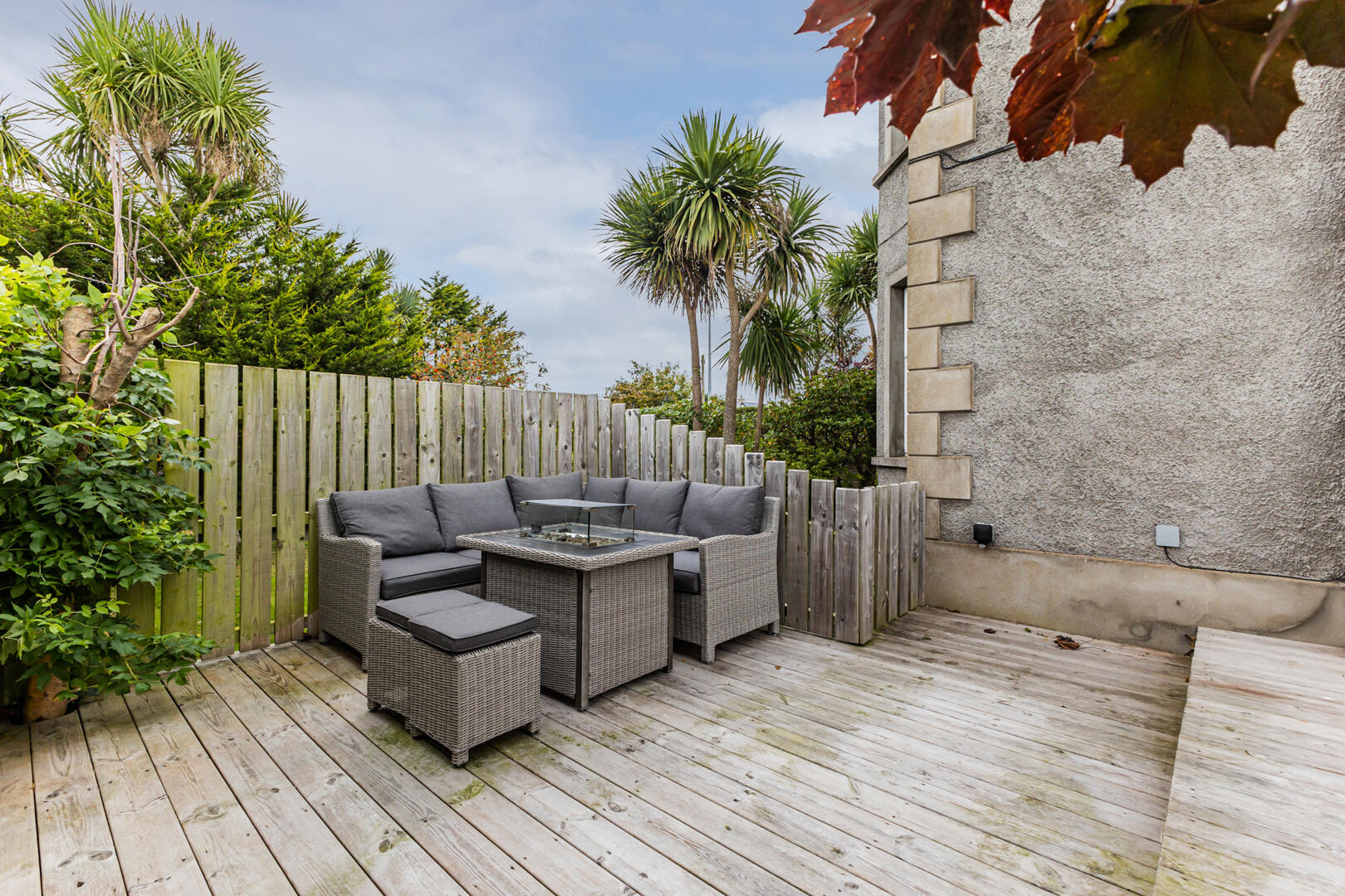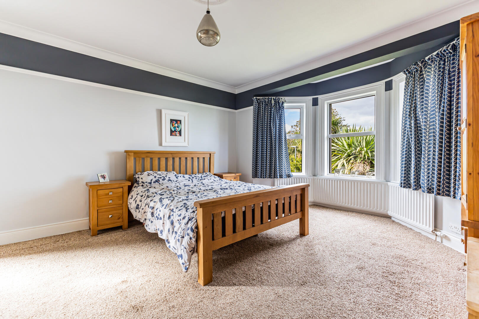 Upstairs on the first floor are three double bedrooms, including a primary suite with an en suite shower room, a study or office, and a main bathroom with a four-piece suite. The top floor offers two additional double bedrooms, both with sea views, one of which has an en suite shower room.