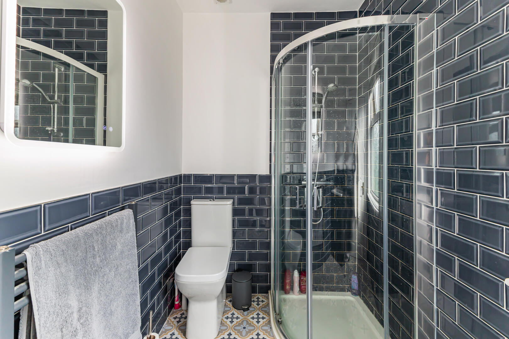 Three piece suite comprising built-in fully tiled shower cubicle, low flush WC, wash hand basin with mixer tap, storage beneath, heated towel rail, fully tiled floor, part tiled walls, extractor fan.