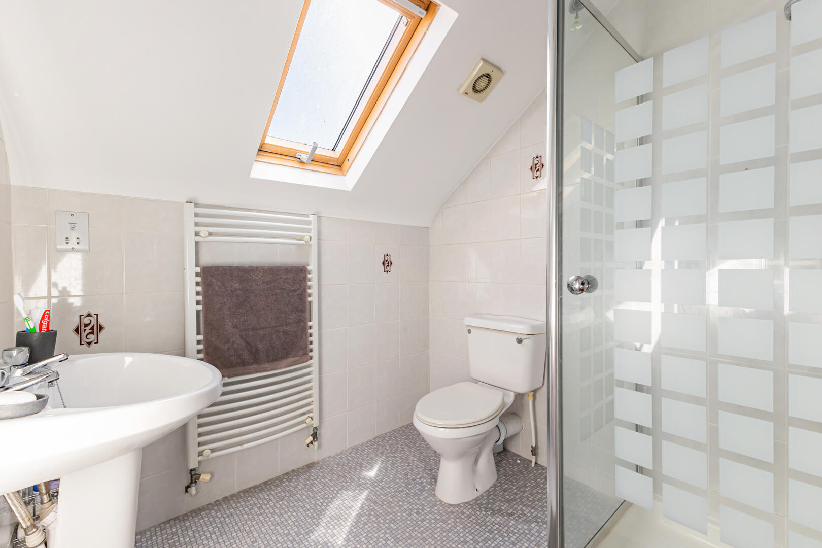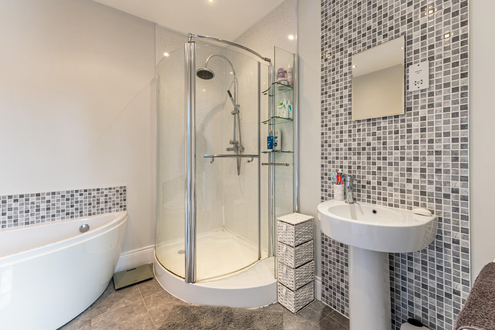 Three piece suite comprising built-in fully tiled shower cubicle, low flush WC, pedestal wash hand basin, heated towel rail, fully tiled walls, extractor fan.