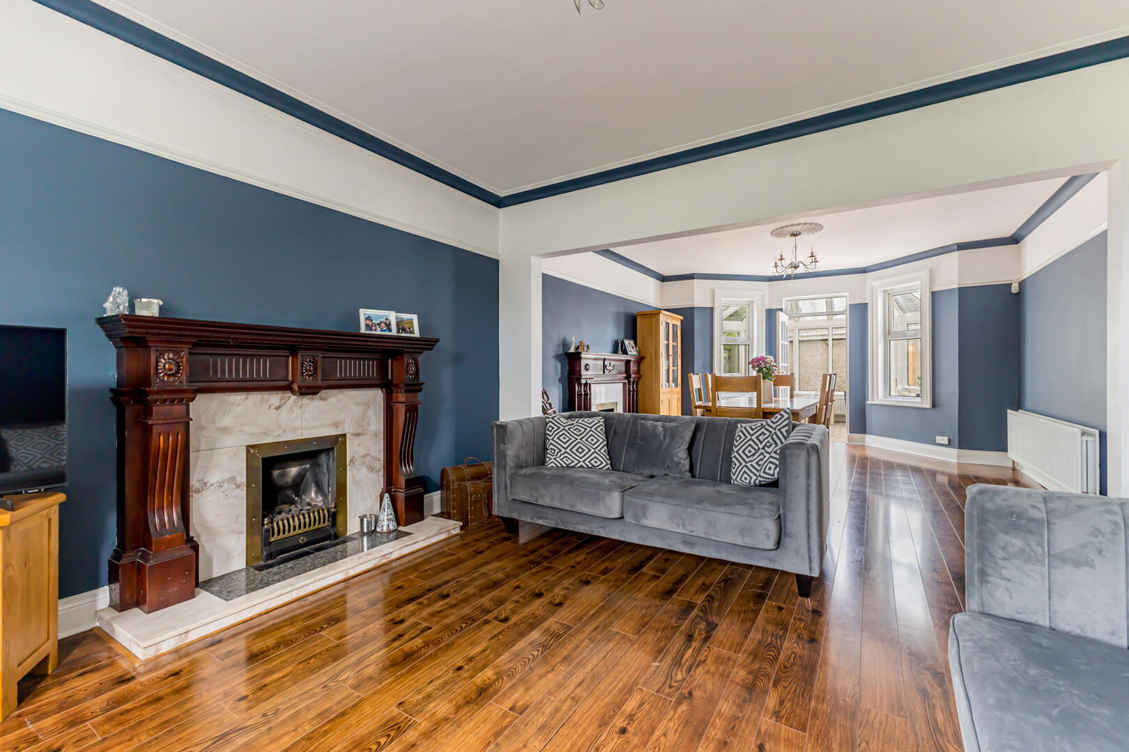 into bay at widest points Living room with attractive carved mahogany fireplace surround, granite inset and hearth, gas coal effect fire, dado rail, cornice ceiling, ceiling rose, bay window.