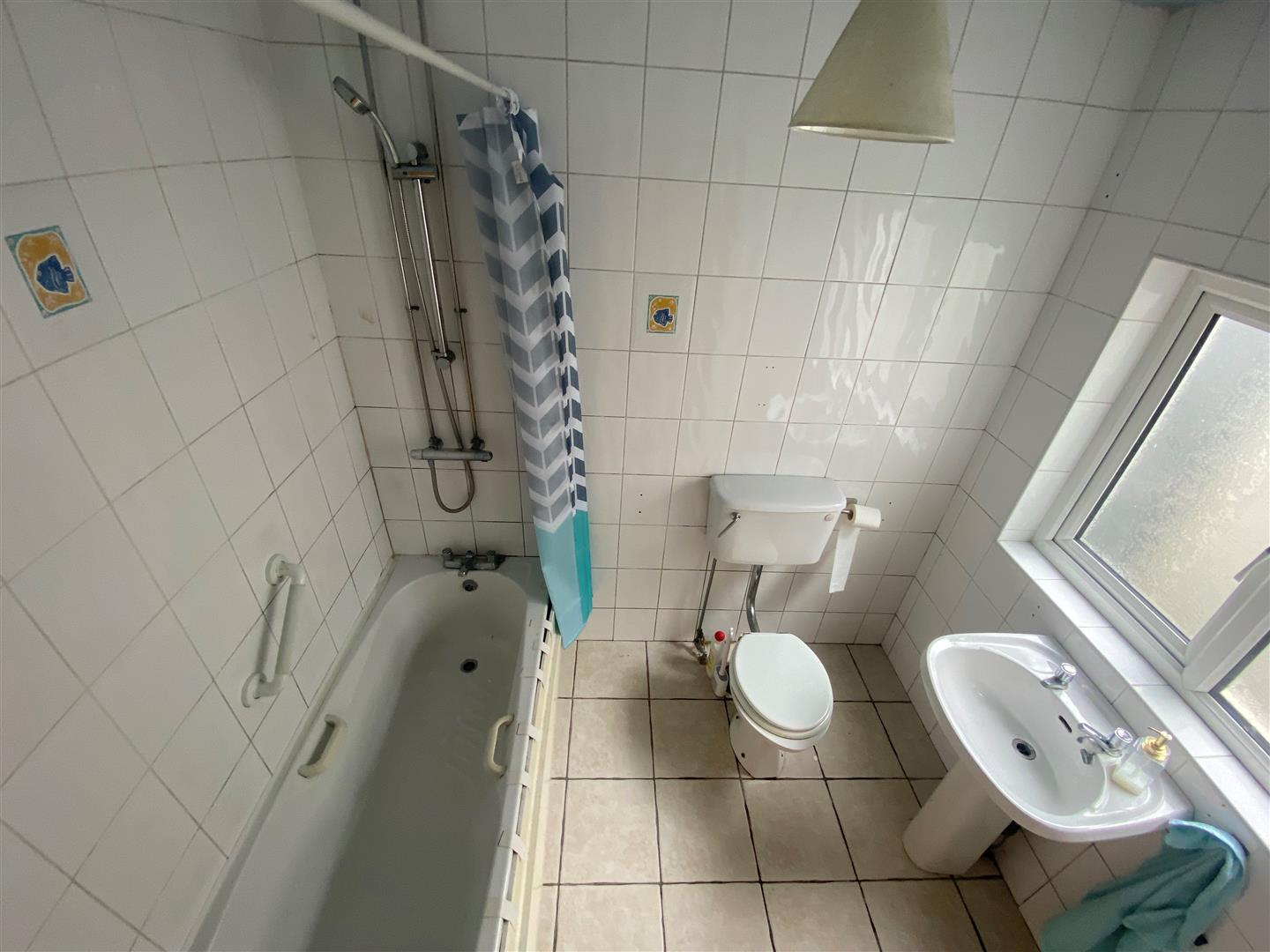 White suite comprising: Panelled bath with mixer tap and Thermostatic shower over. Pedestal wash hand basin. W.C. Tiled walls. Ceramic tiled floor.