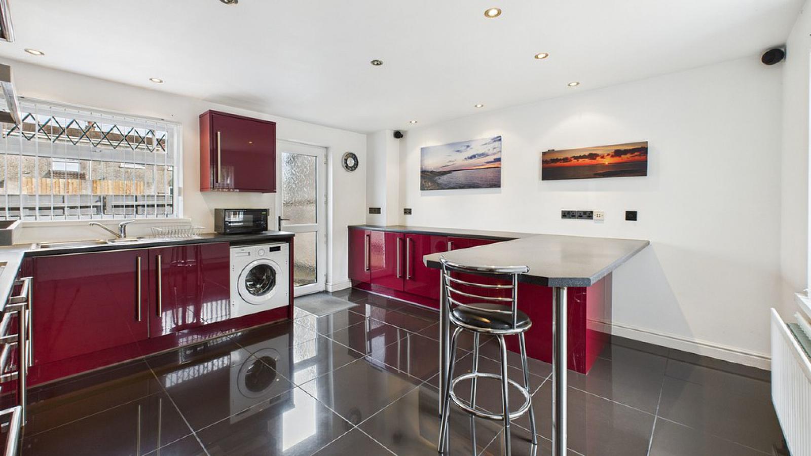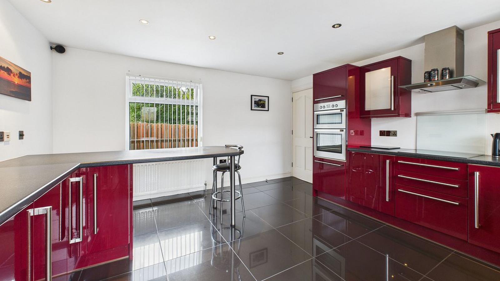 KITCHEN / DINING AREA 13' 9" x 13' 9" (4.19m x 4.19m) Excellent range of high and low level units with drawers and complementary work surfaces; four ring ceramic electric hob and integrated double oven; extractor hood; sink unit and side drainer; plumbed for washing machine; breakfast bar; tile floor; access to rear garden.