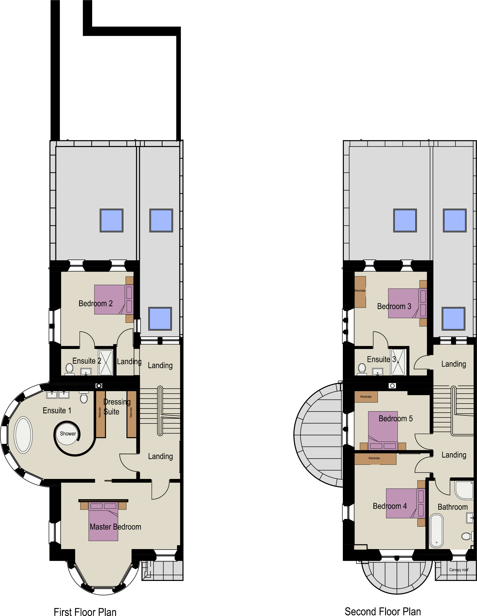 Built originally for Robert Russell, the house features an elegant two-bay façade with a two-storey bow window and ornate architectural details typical of the era. The property includes a large three-storey rear return and a two-storey gabled extension, providing a generous internal footprint.