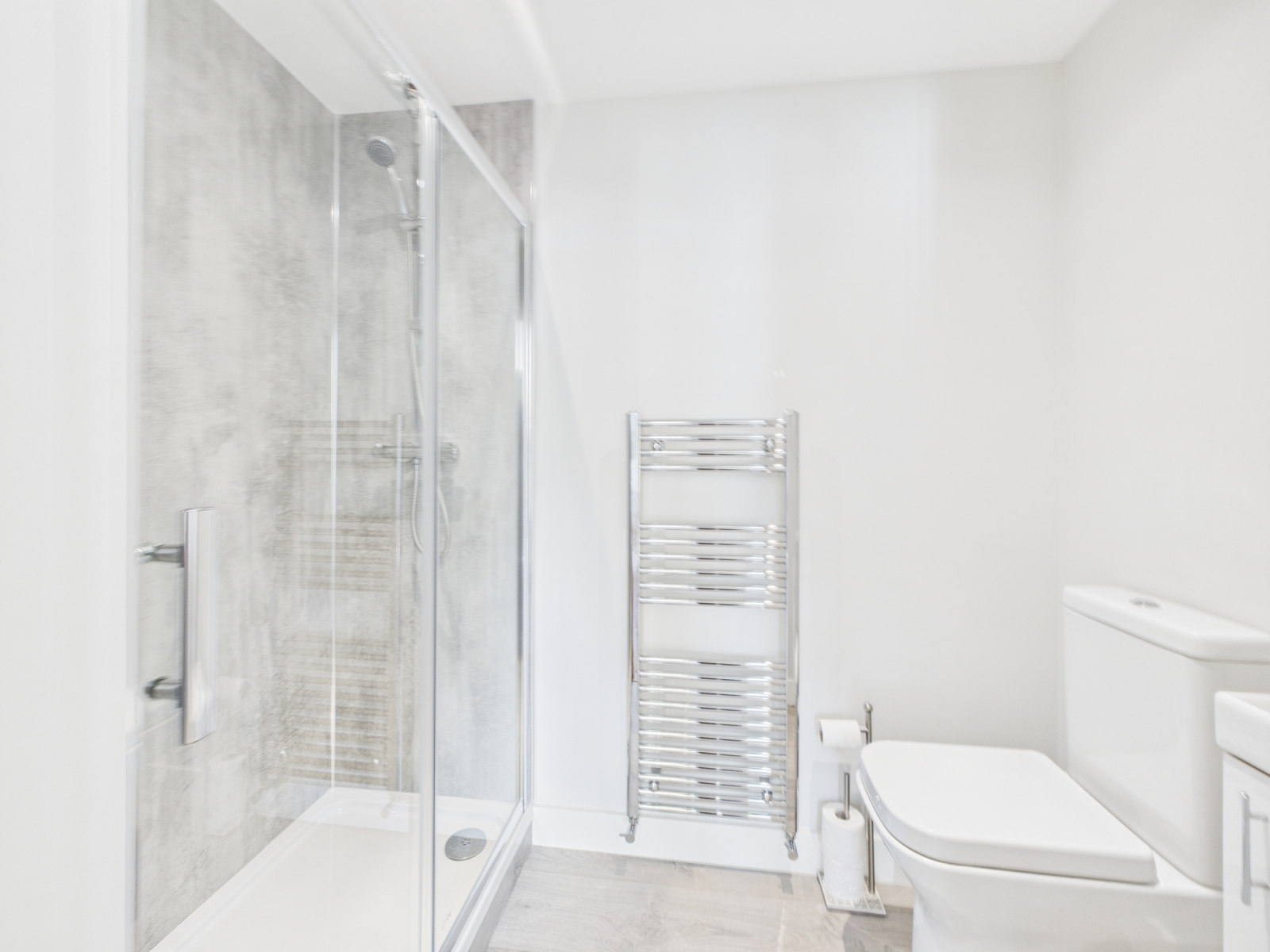 White suite comprising: Low flush WC, vanity sink unit, double shower cubicle with thermostatic shower unit, chrome heated towel radiator, chrome spotlights, extractor fan.