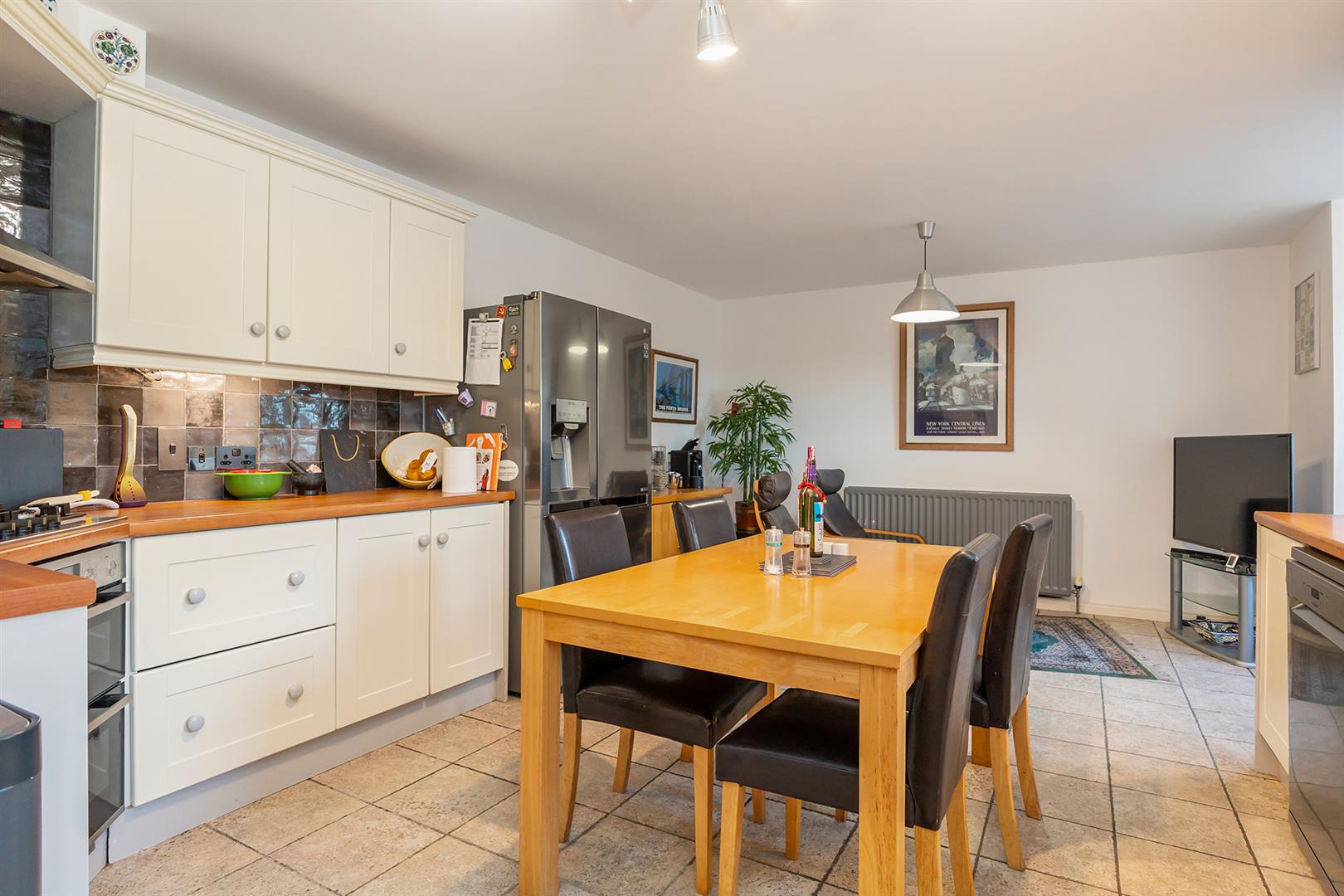 Range of high and low level units, laminate work surfaces, one and a half bowl single drainer stainless steel sink unit with mixer tap and water filter tap, integrated Bosch double oven, integrated Bosch five ring gas hob, tiled splashback, extractor fan above, plumbed for dishwasher, space for fridge freezer, fully tiled floor, part tiled walls.