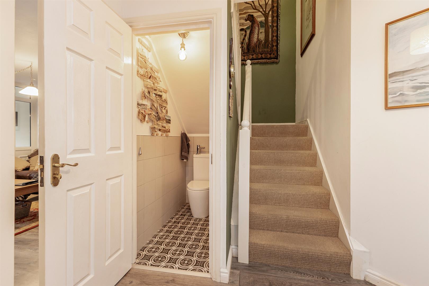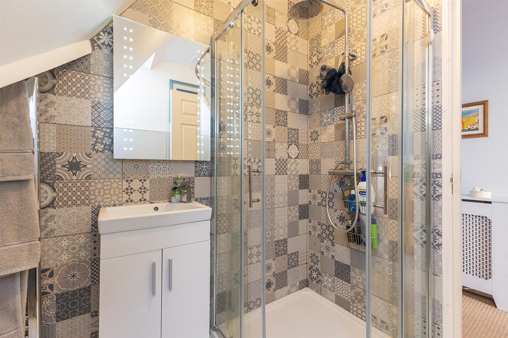 Three piece suite comprising built-in fully tiled shower cubicle, wash hand basin with mixer tap, storage beneath, low flush WC, fully tiled floor, part tiled walls, chrome heated towel rail, extractor fan.