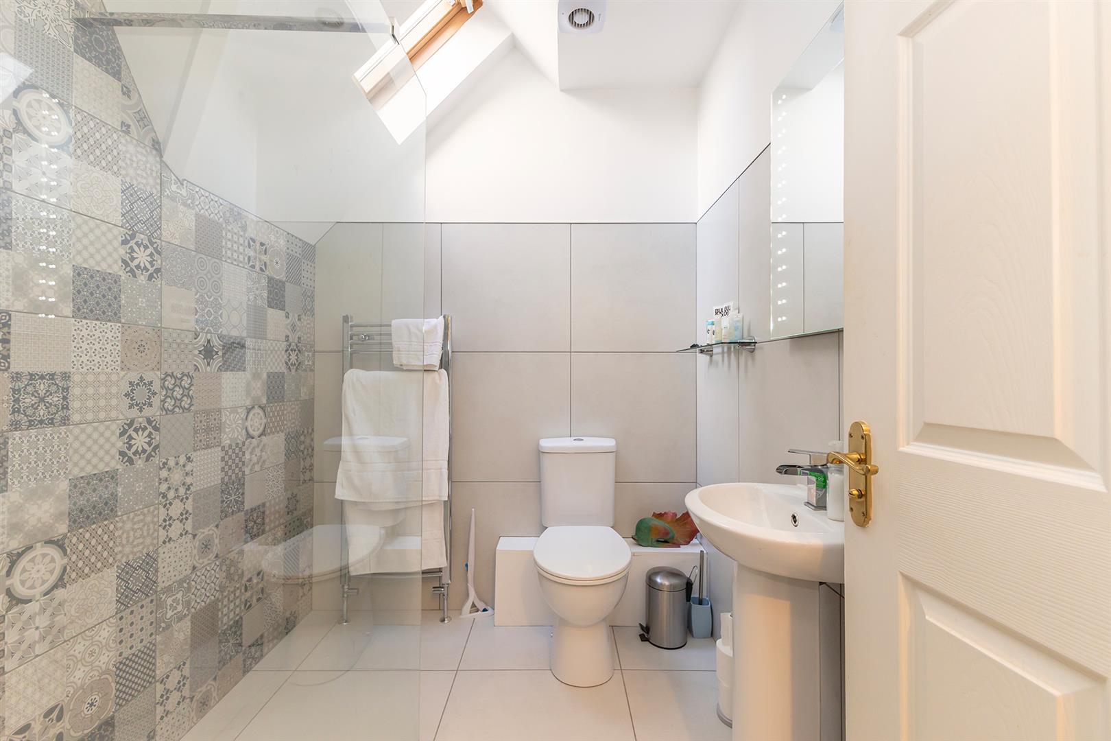 Three piece suite comprising large walk-in shower cubicle with hand shower, low flush WC, pedestal wash hand basin with mixer tap, fully tiled floor, part tiled walls, chrome heated towel rail, extractor fan.