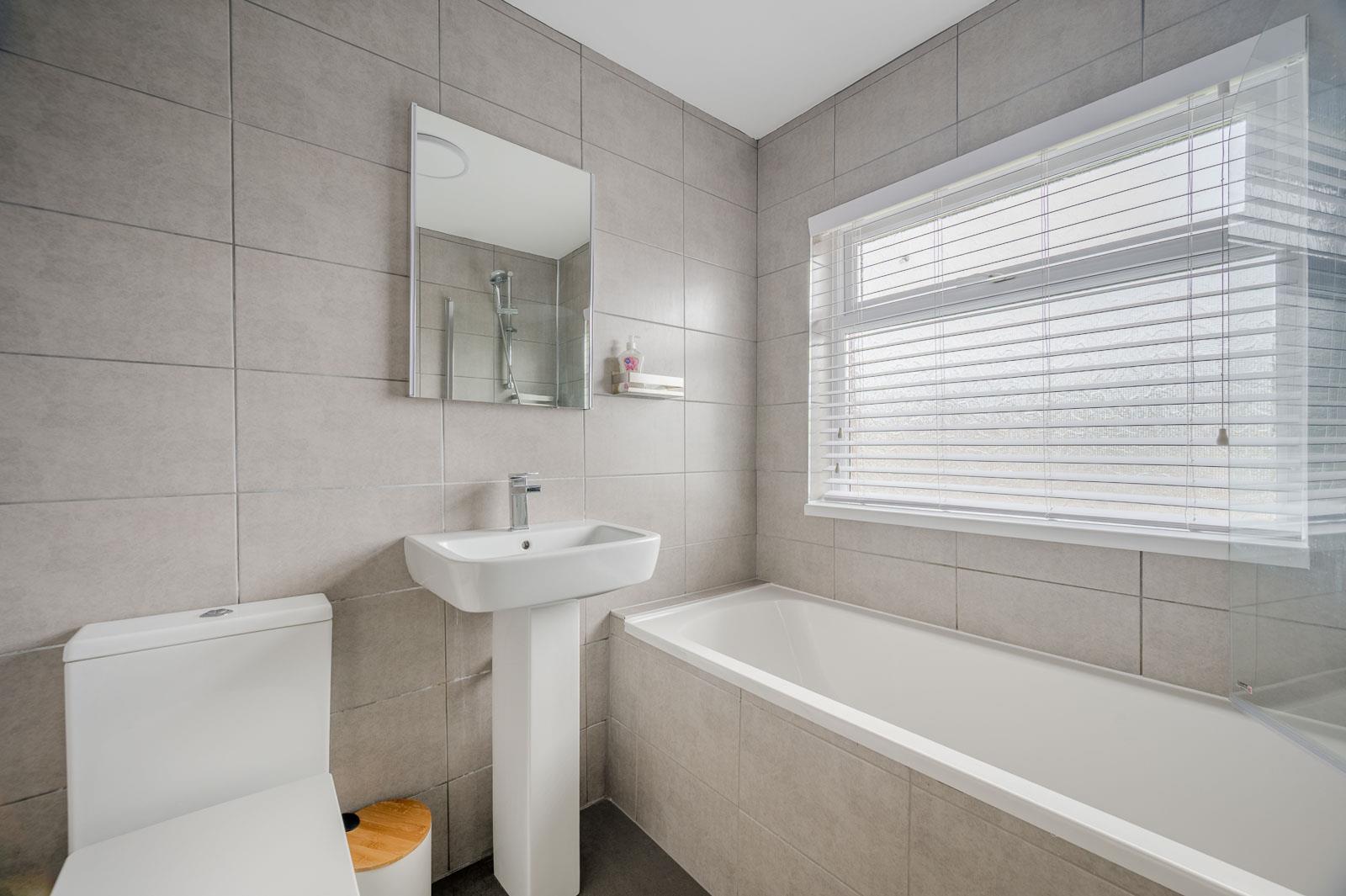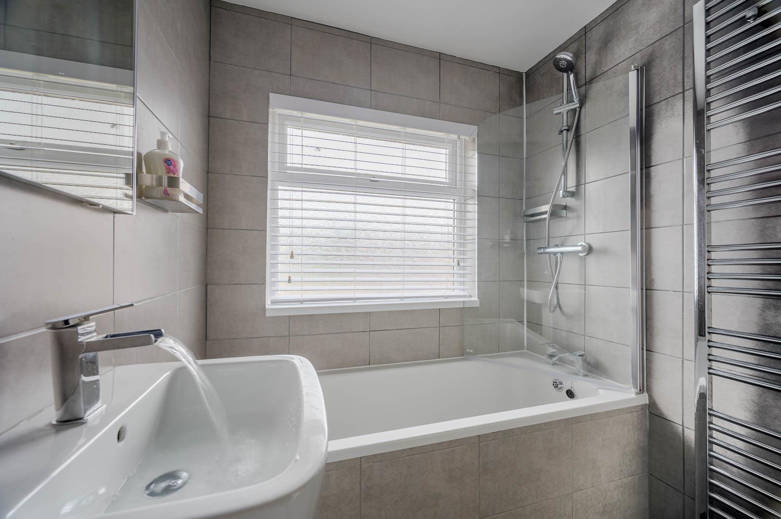 Recently renovated with a contemporary white suite comprising a bath with shower combo, low flush WC, and pedestal wash hand basin.