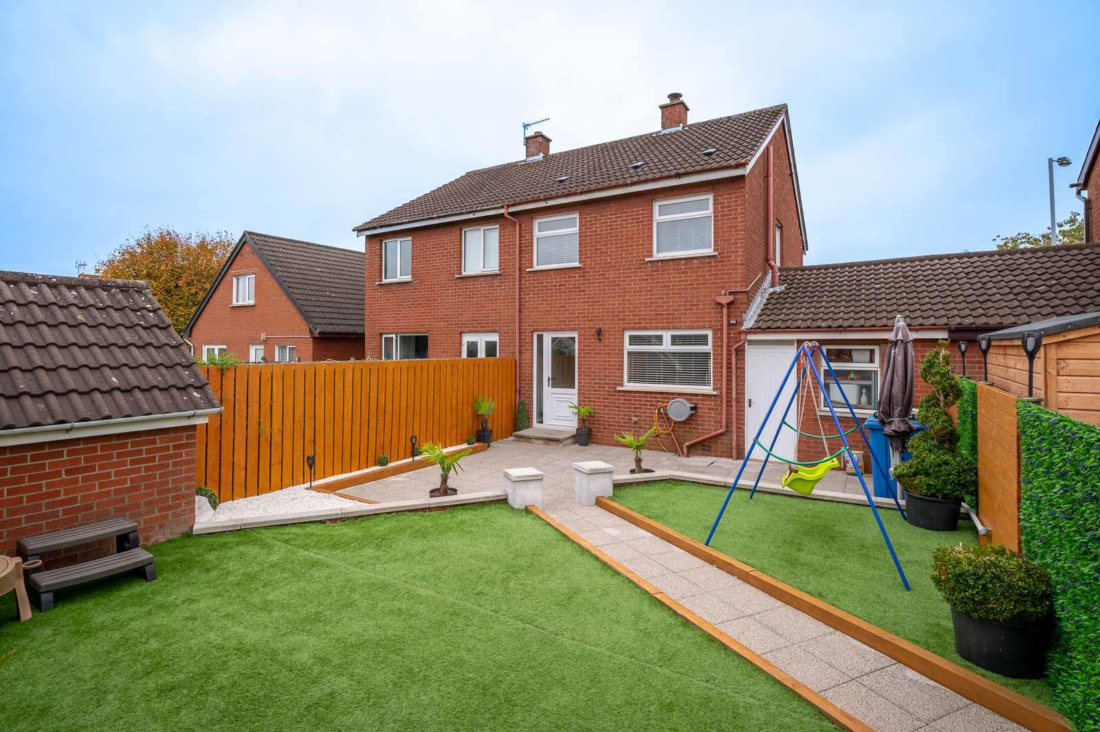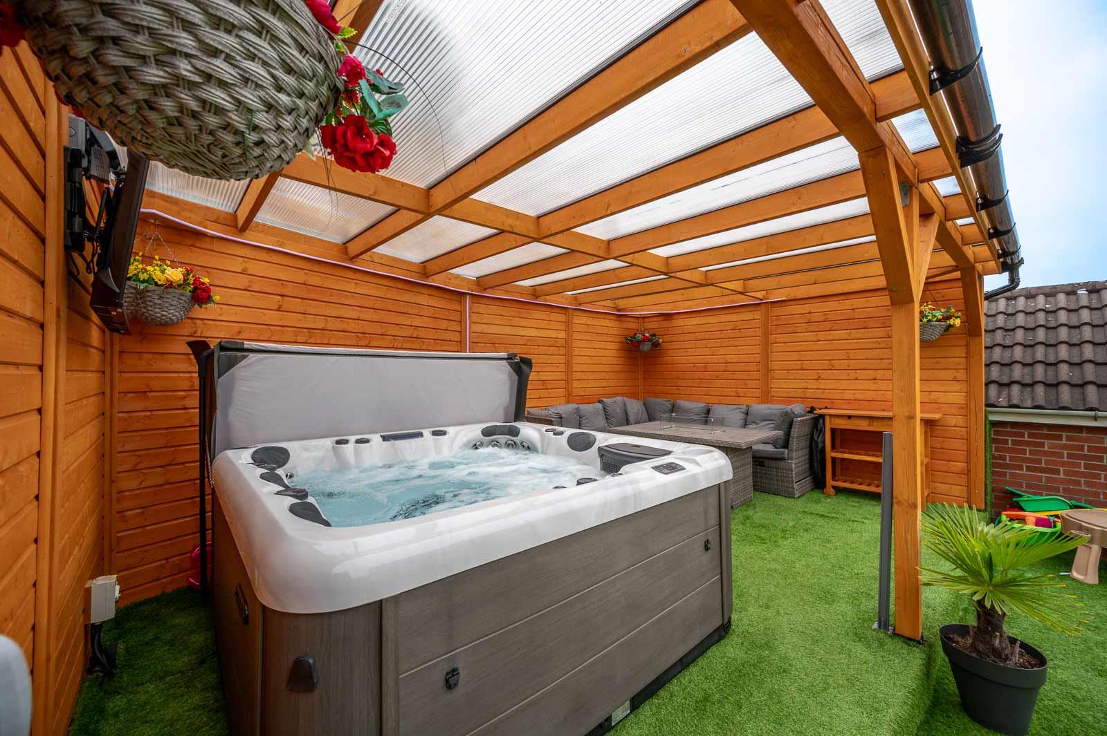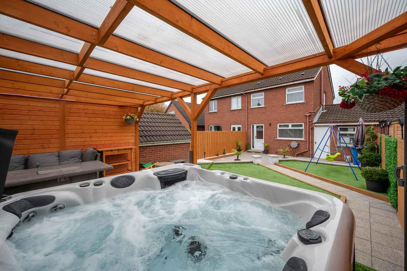 Outside, the property continues to impress with a tarmac driveway offering ample parking, an integrated garage with plumbing and a fully enclosed landscaped rear garden featuring astroturf, paving and decorative pebbled borders. A large, covered veranda with electricity provides the perfect outdoor entertainment space all year round.