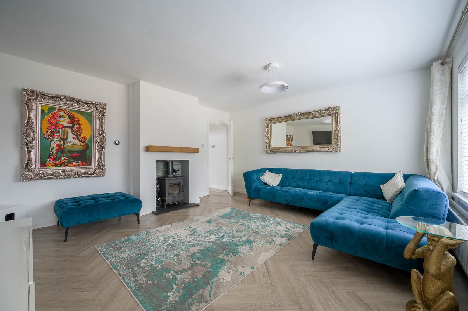Elegant wood-effect herringbone flooring complemented by a striking multi-fuel log burner; creating a warm and stylish focal point.