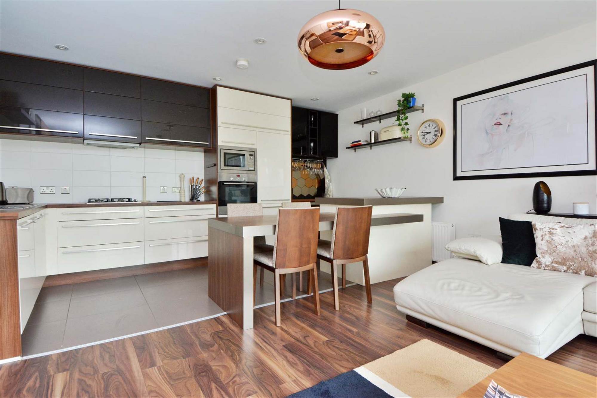 Range of high and low level high gloss units, built-in oven, gas hob and extractor fan, integrated microwave, dishwasher, fridge/freezer, wine fridge, island unit with under storage, stainless steel sink unit with mixer tap, laminate work surfaces, ceramic tiled flooring.