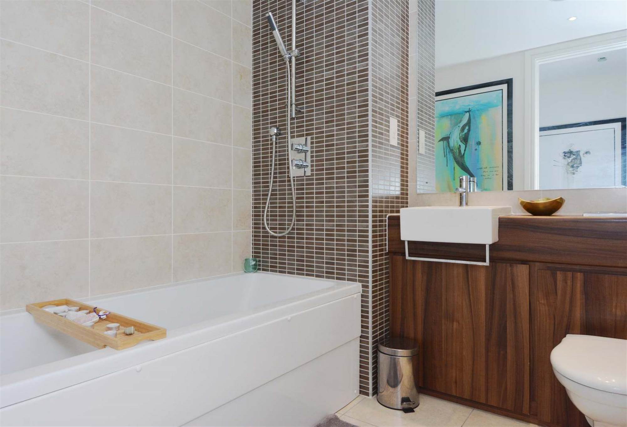Low flush wc, wash hand basin with built-in vanity unit, both with overhead shower, fully tiled, extractor fan, heated towel rail.