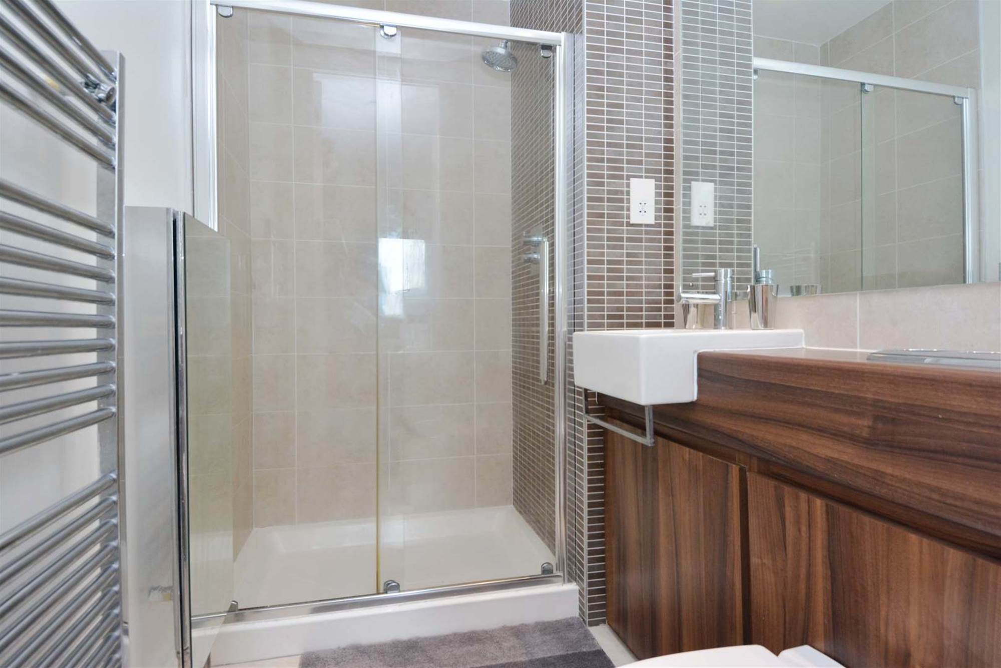 Low flush wc, wash hand basin with vanity unit, walk-in double shower cubicle, chrome heated towel rail, fully tiled, extractor fan.