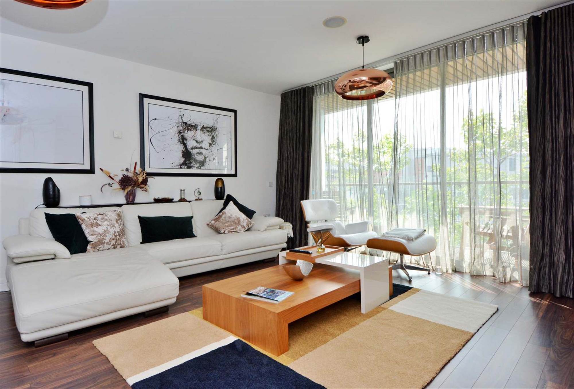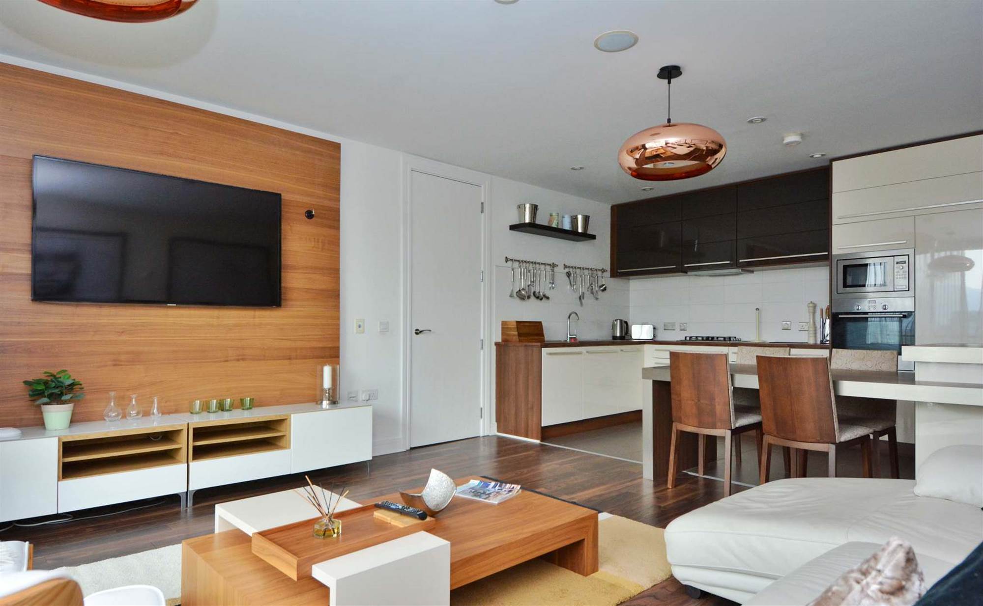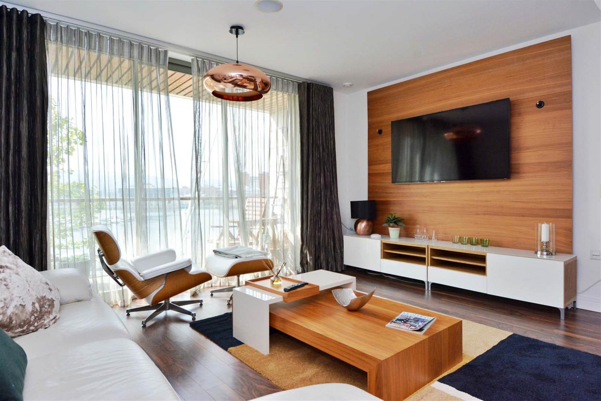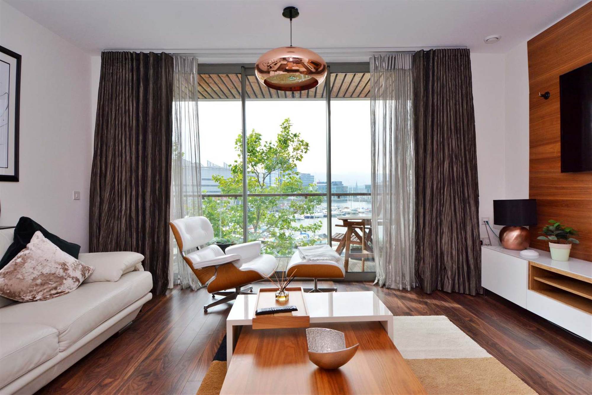 Wood strip flooring, feature media wall, sliding patio door to balcony with Lagan views.