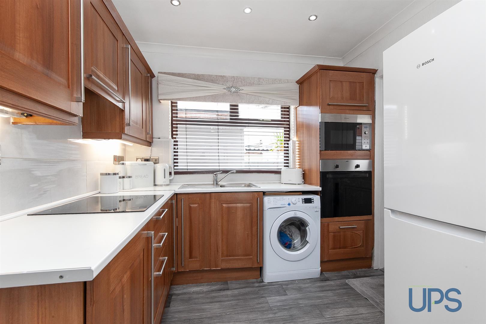 Range of high and low level units, formica work surfaces, built-in oven and microwave, 4 ring hob, plumbed for washing machine, sink unit. Feature flooring.