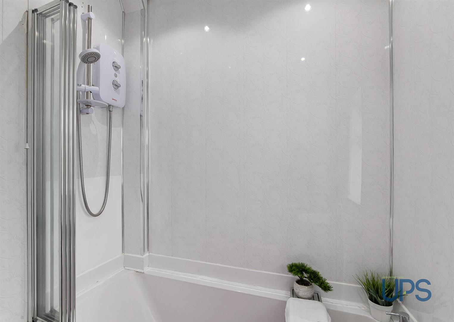 Panelled bath, wash hand basin, low flush w.c, pvc wall coverings, electric shower unit.