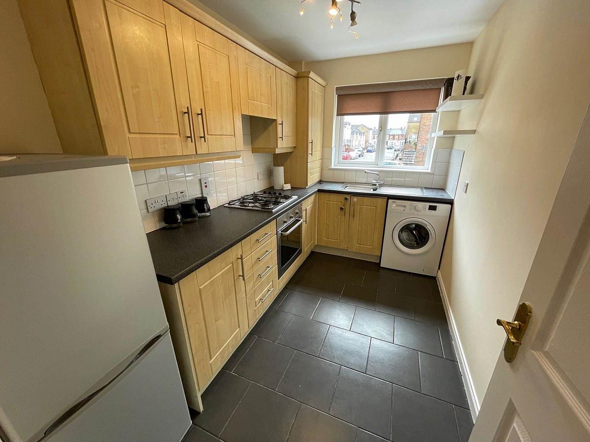 Range of high and low level units with built in gas hob and electric oven, extractor over, space for washing machine and fridge/freezer. Part tiled walls and tiled floor.