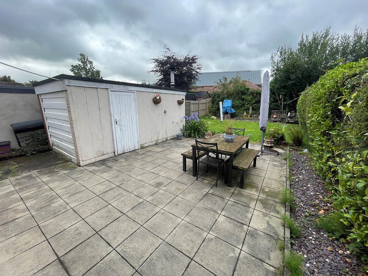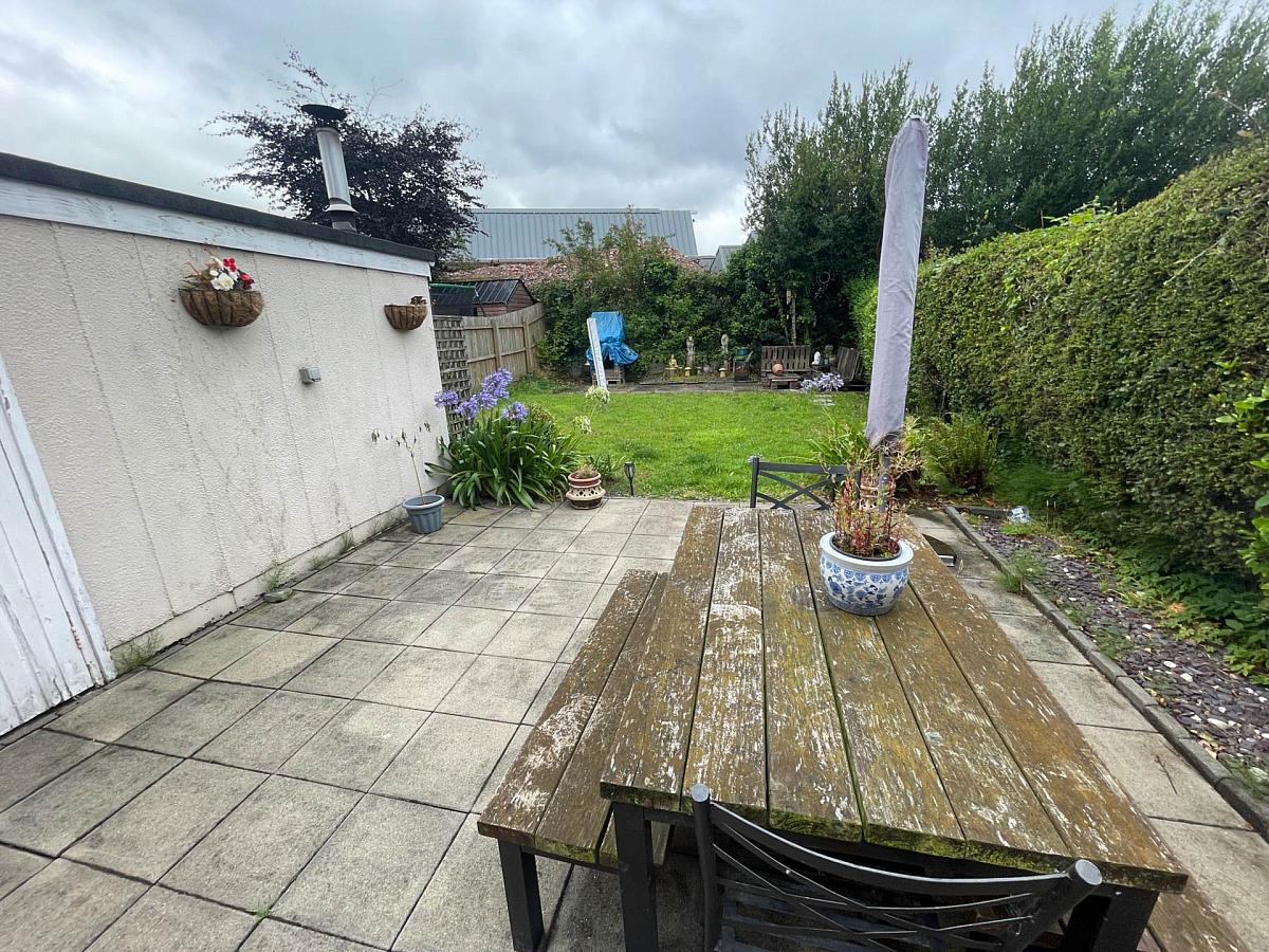 Spacious rear garden with paved patio, lawn, detached garage
