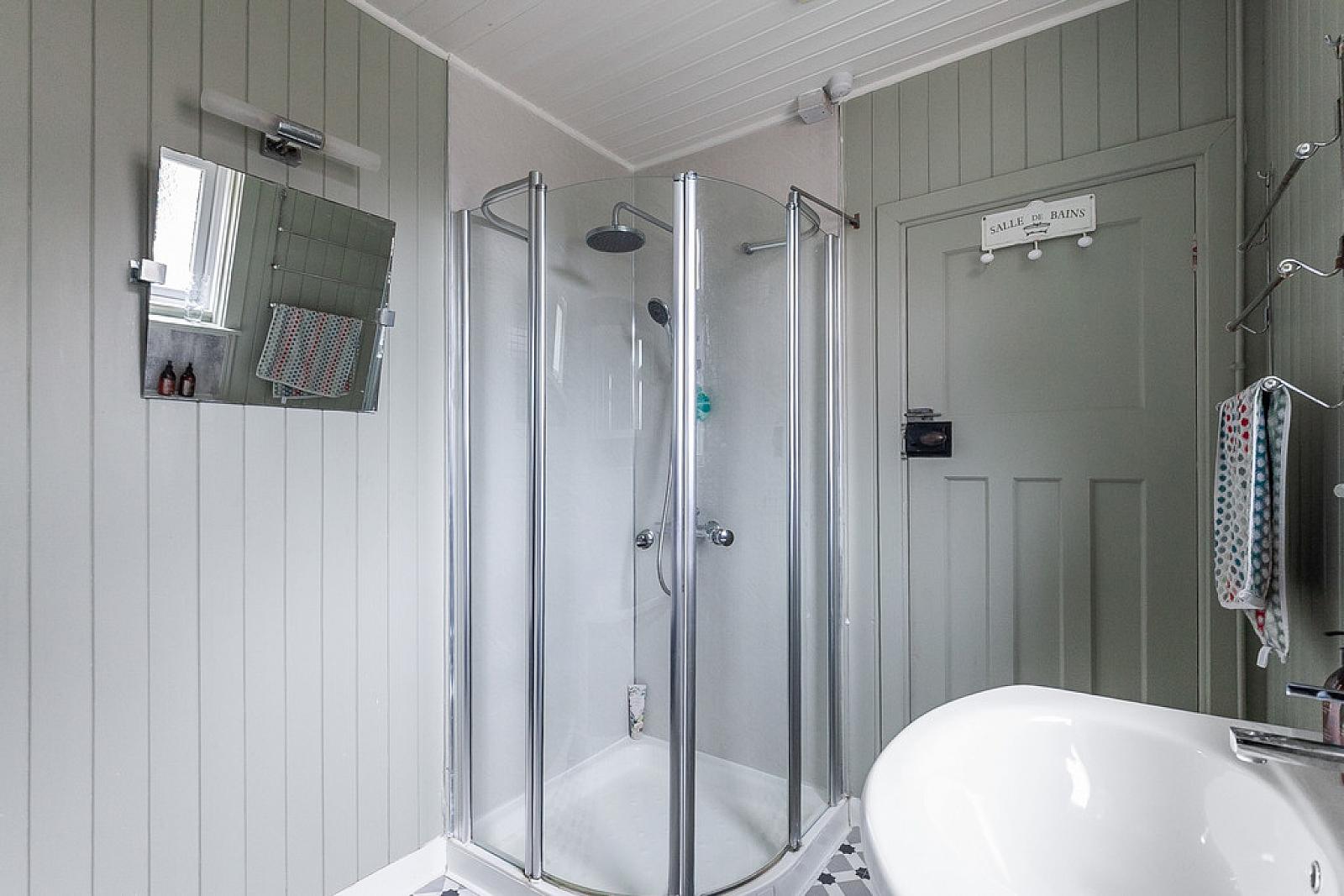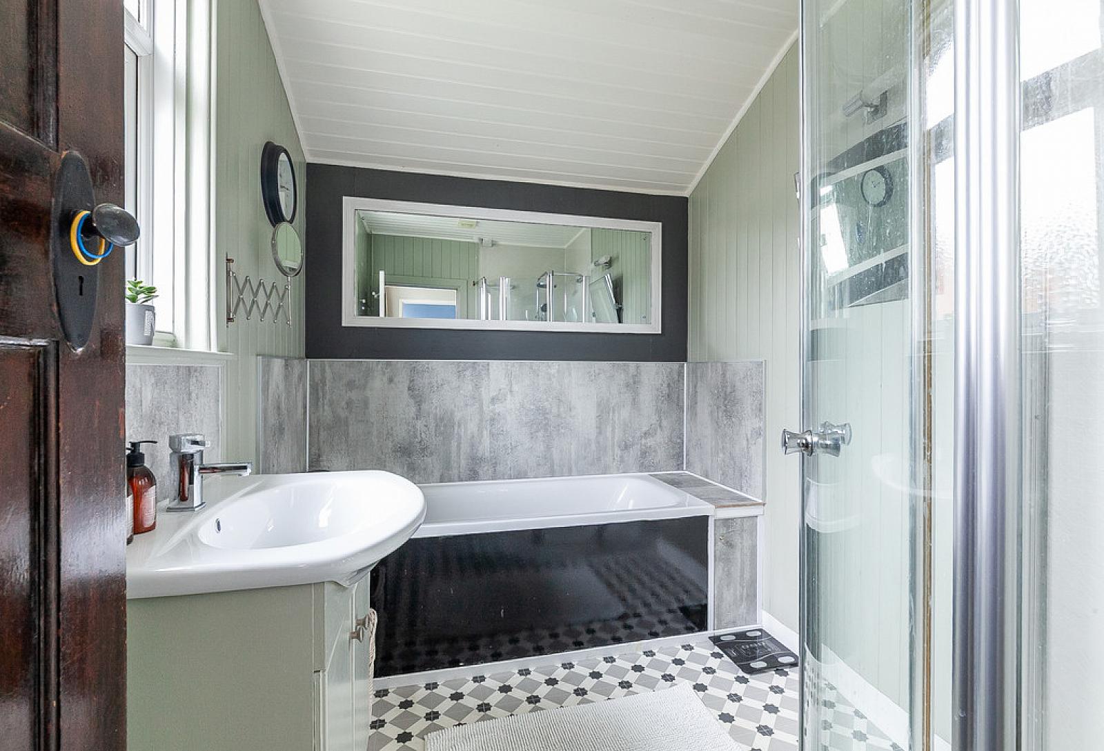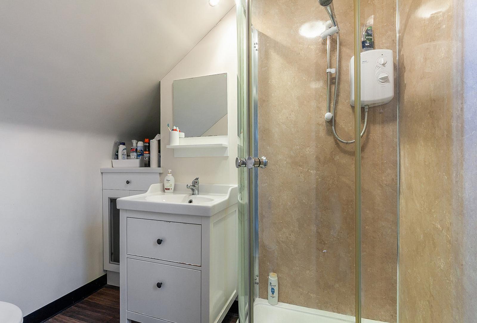 BATHROOM White suite comprising panelled bath with panelled surround, panelled shower cubicle with rainwater shower, vanity unit with storage, part tongue and groove walls, tongue and groove ceilings.