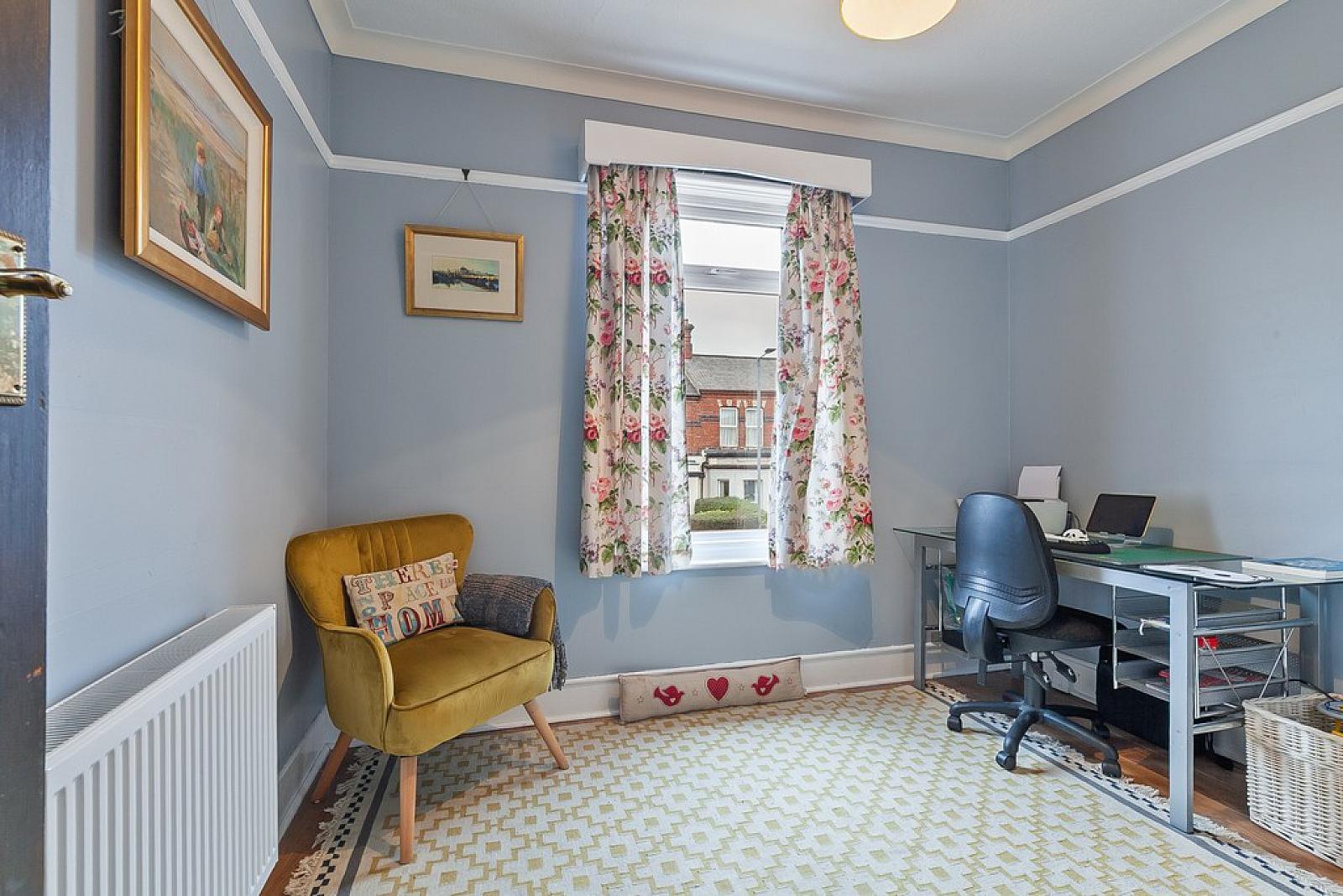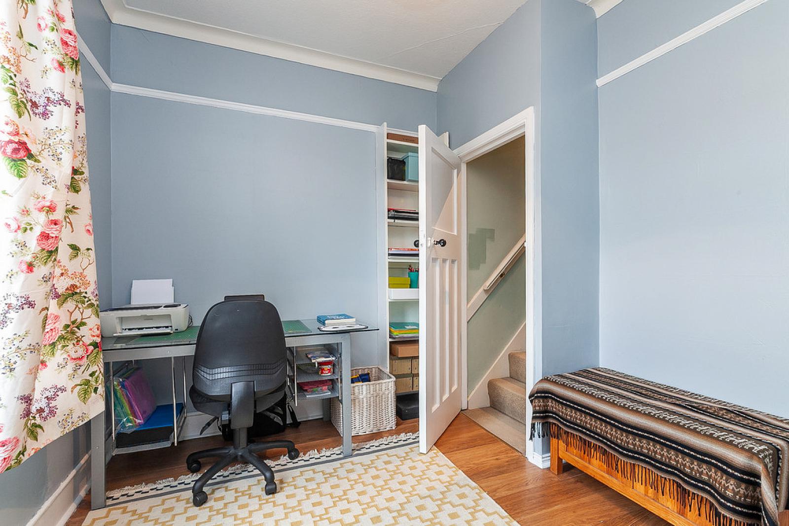 BEDROOM / STUDY 10' 6" x 9' (3.2m x 2.74m) Laminate wood effect floor, access to staircase leading to second floor attic room.