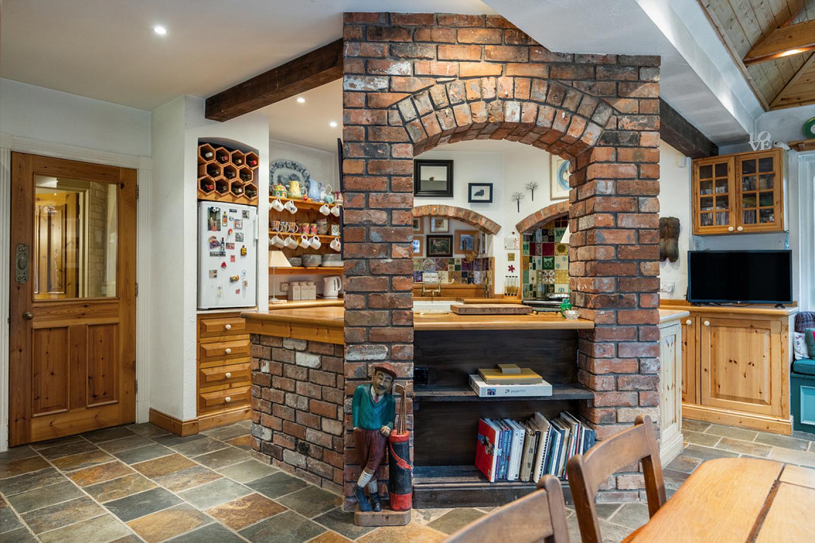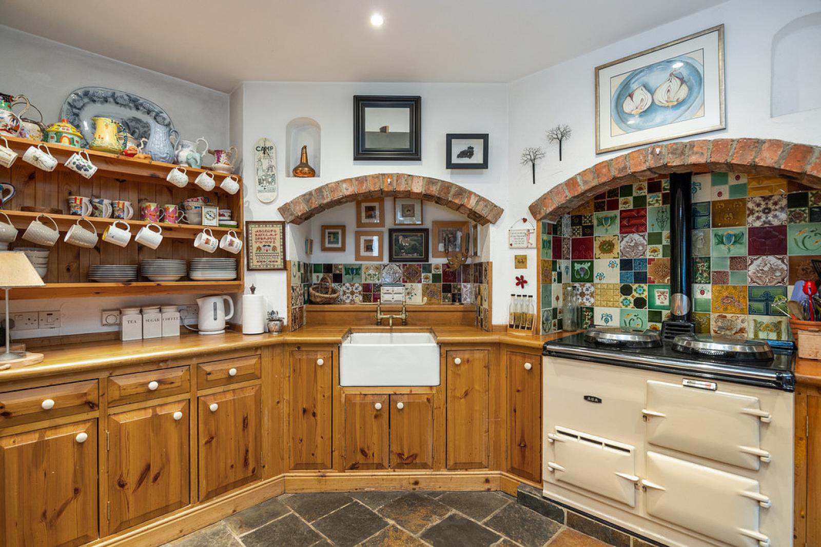 OPEN PLAN KITCHEN/LIVING/DINING AREA 20' 0" x 17' 2" (6.1m x 5.24m) Range of fitted kitchen units, wooden worksurfaces, tiled splashbacks, AGA range cooker, recessed low voltage spoltights, tiled floor, French doors to rear garden.