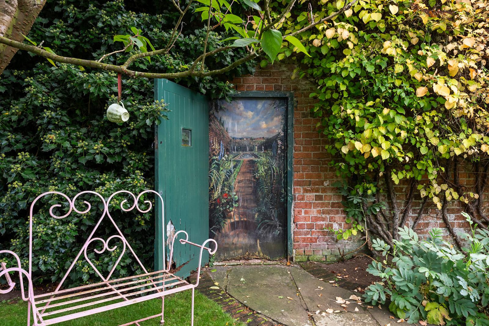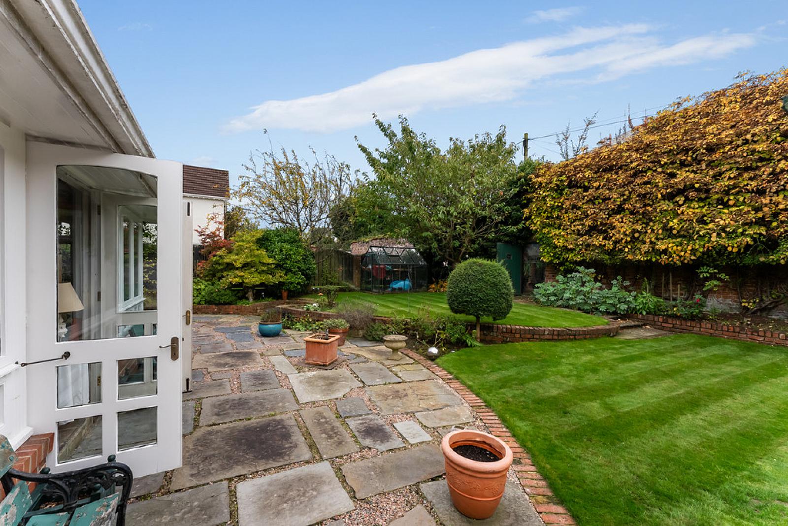 Mature private south facing rear garden with gravel driveway and detached garage