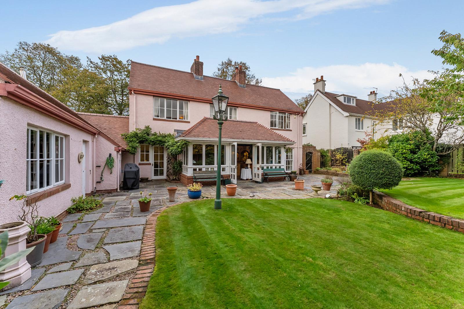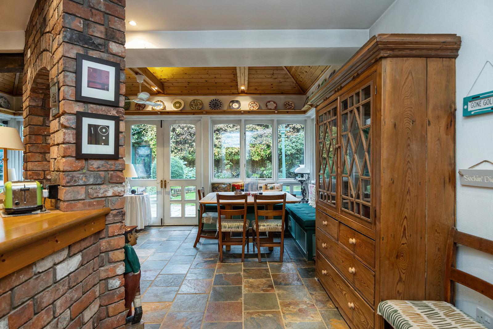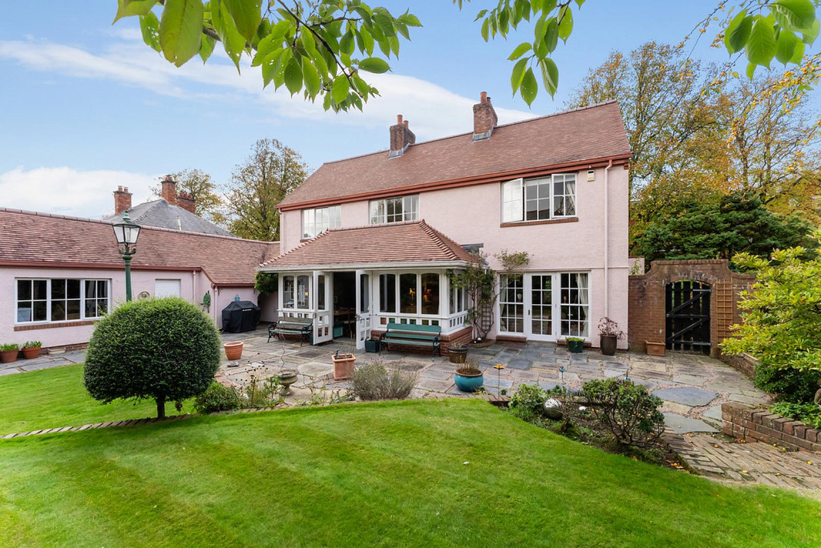 Externally, the home is further enhanced by a superbly maintained private south-facing rear garden with mature flowerbeds, trees and shrubs, creating a peaceful outdoor retreat. To the front, a gravel driveway provides ample parking and leads to a detached garage.