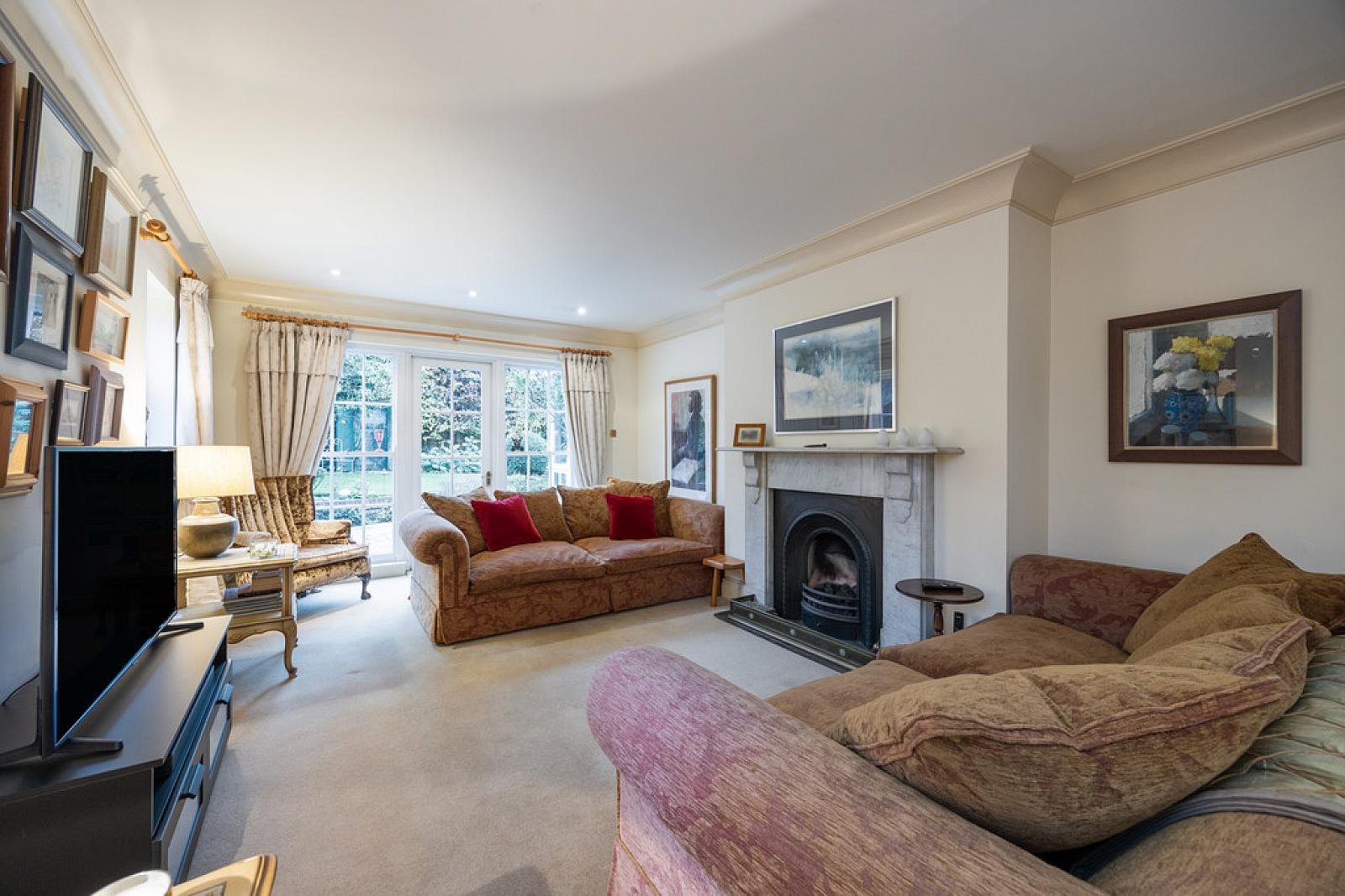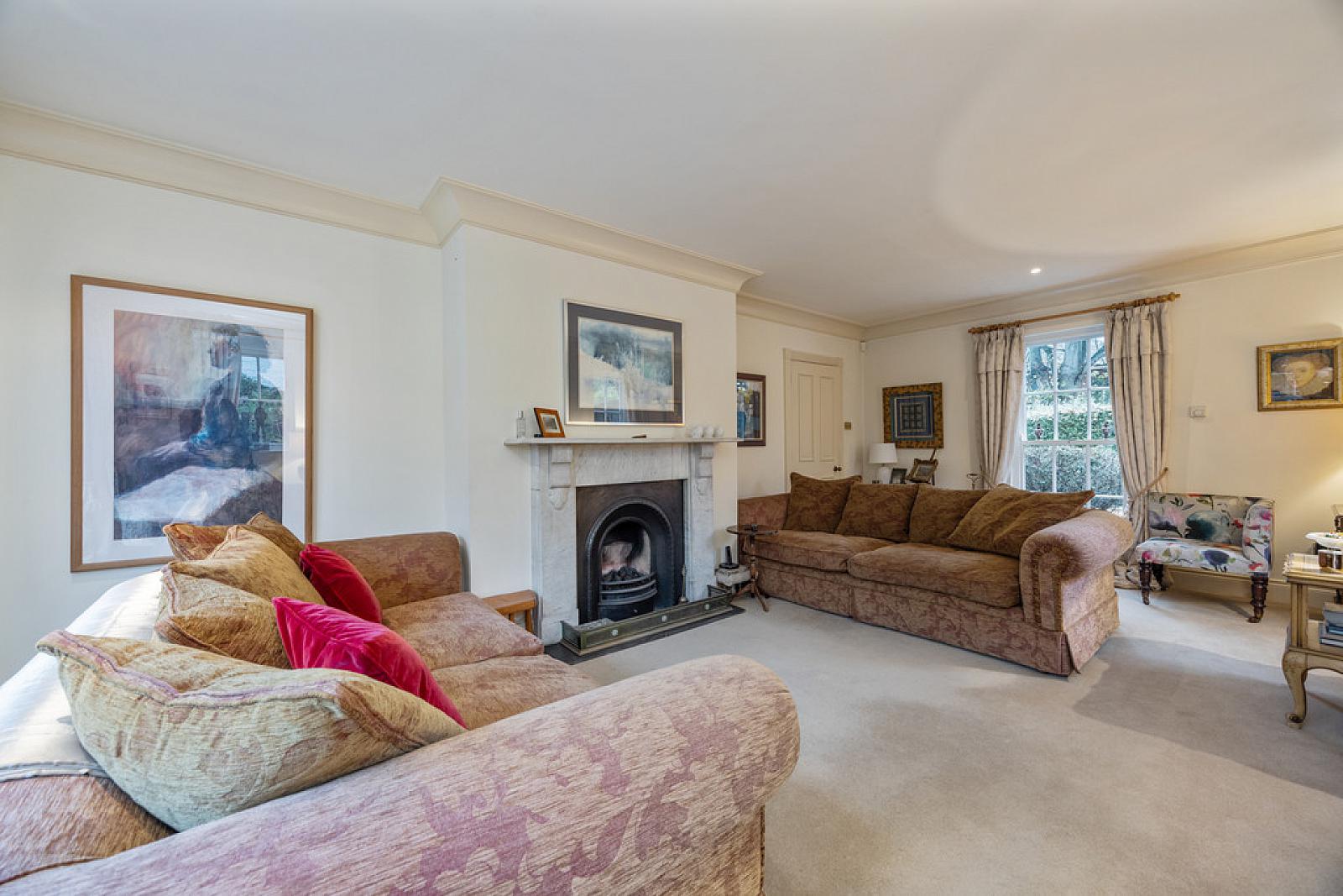 DRAWING ROOM 23' 1" x 12' 11" (7.04m x 3.94m) Fireplace with marble surround and cast iron inset with slate hearth, cornice ceiling, recessed low voltage spotlights, access to rear garden.
