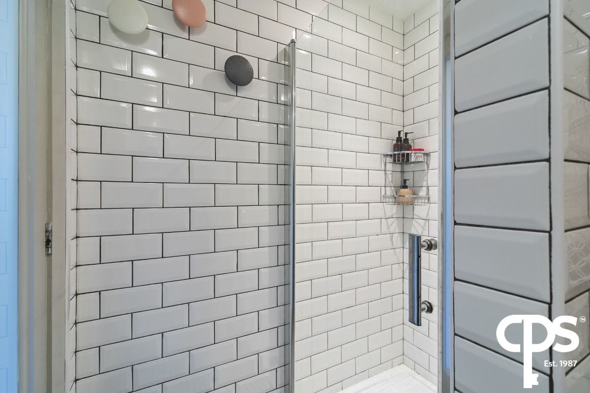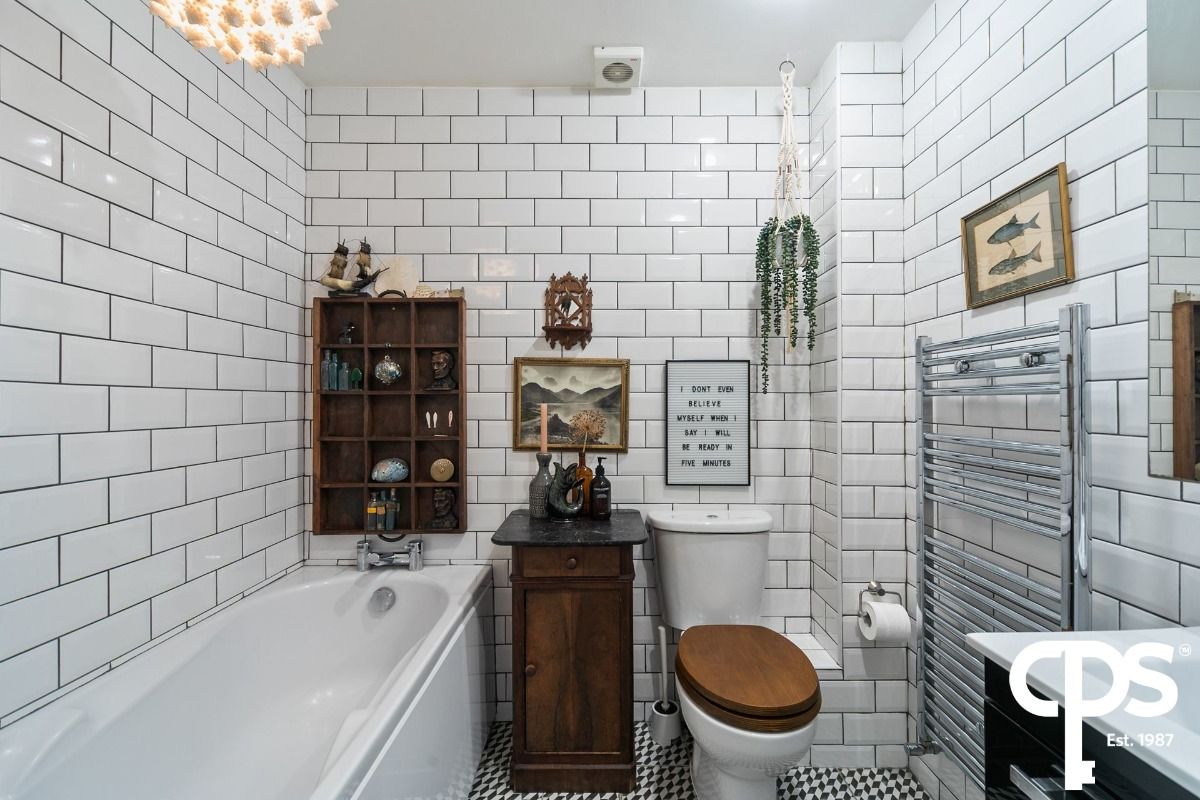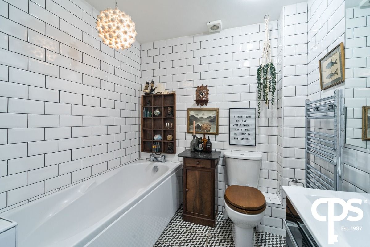 Tiled flooring, floor to ceiling white brick wall tiles, fitted panel bath with chrome tap, low flush WC, wall hung vanity unit with wash hand basin and chrome tap, chrome effect towel heater, shower cubicle with glass door, chrome effect shower unit, extractor fan, wall hung mirrored vanity cabinet.