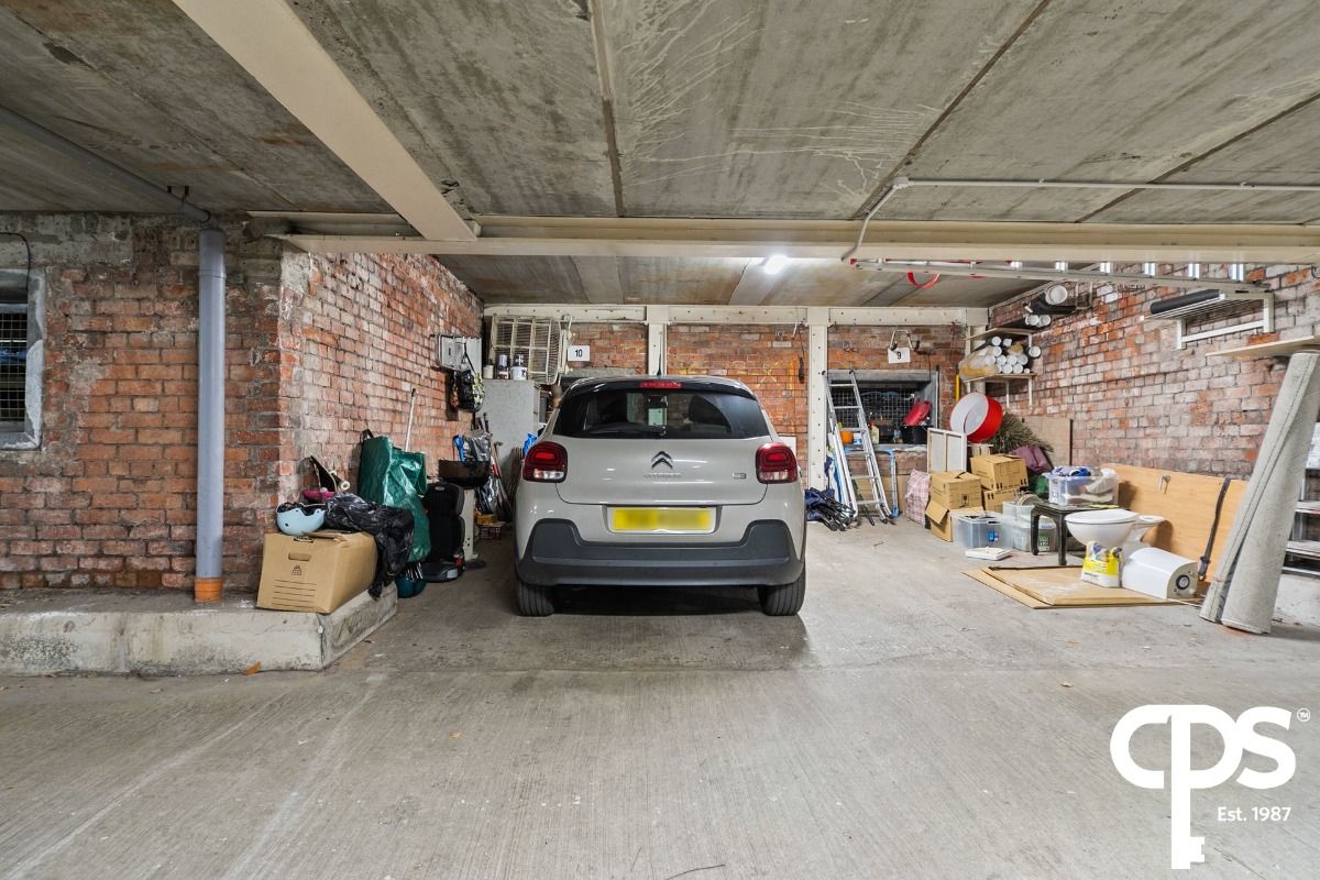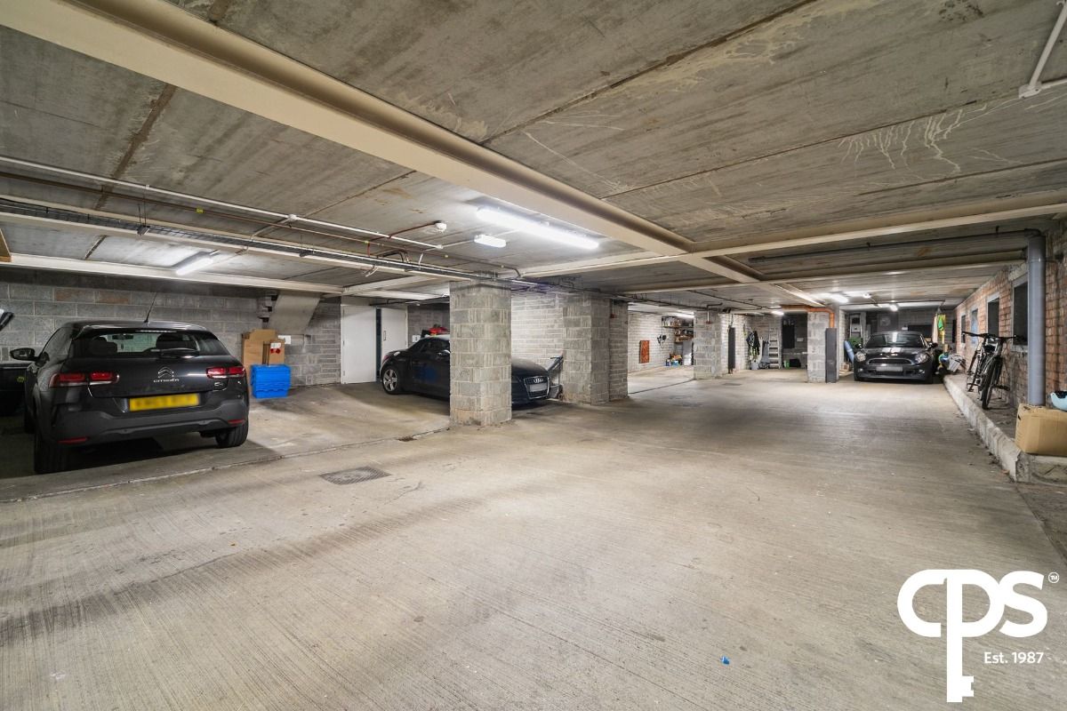 Enclosed parking garage with allocated parking space, communal garden areas.