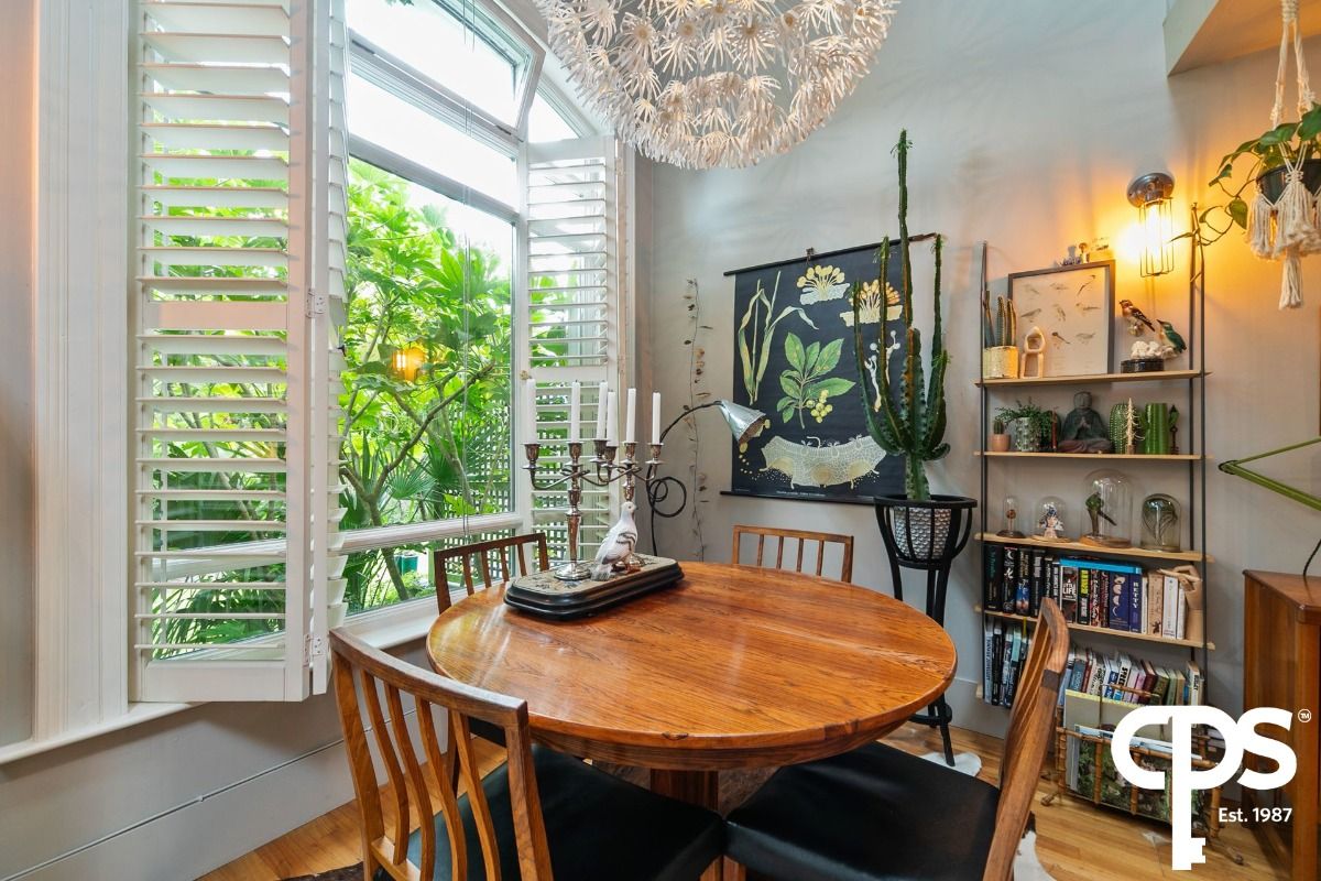 Floor-to-Ceiling Windows with Feature Wooden Shutters.