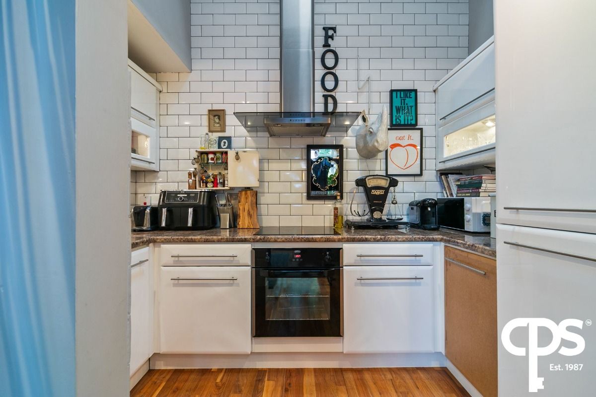 Engineered wood flooring, range of high- and low-level high gloss units, stainless steel sink with chrome effect tap, integrated single oven, 4 ring ceramic hob, stainless steel extractor hood, integrated slimline dishwasher, integrated 50/50 fridge freezer, stone worktops, feature white brick wall tiles, under cabinet spotlights, ceiling spotlights.