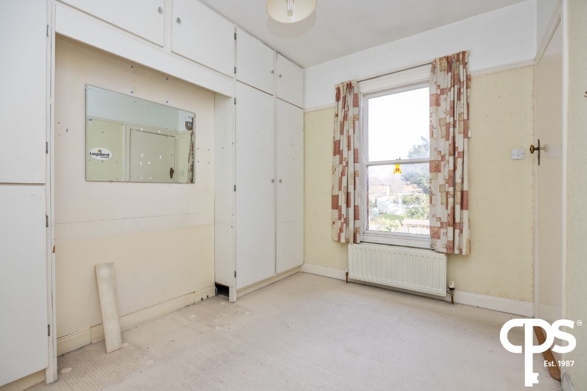 Double room with built in storage and views of rear garden.