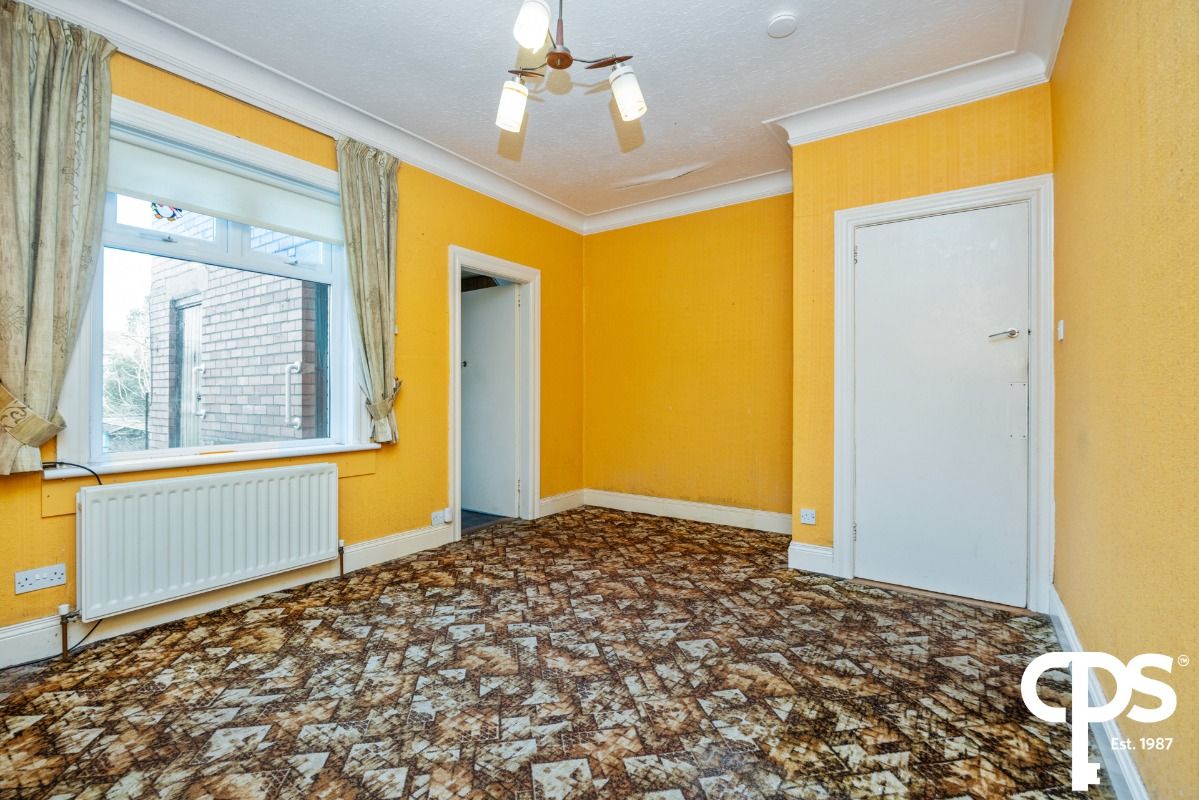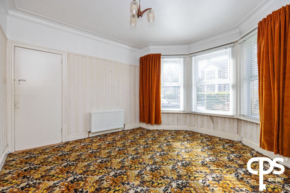 Spacious living area with bay window allowing copious amounts of light flood the room. The room also benefits from a fireplace with a solid wooden mantle and a tiled surround.
