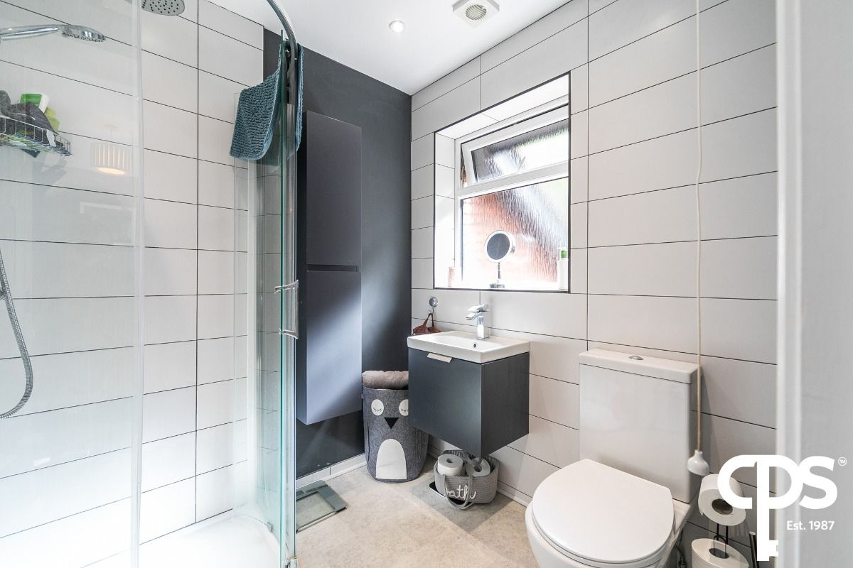 Tile flooring, floor to ceiling wall tiles, corner shower enclosure with chrome waterfall shower head and shower wand attachment, wall hung vanity unit wash hand basin with chrome mixer tap, low flush WC, spotlights, extractor fan.