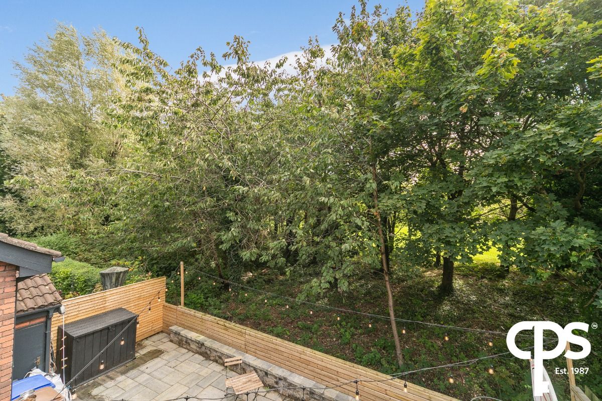 Privately enclosed rear garden area with feature Indian stone paving, cold water external tap, fencing enclosure and access to boiler house,