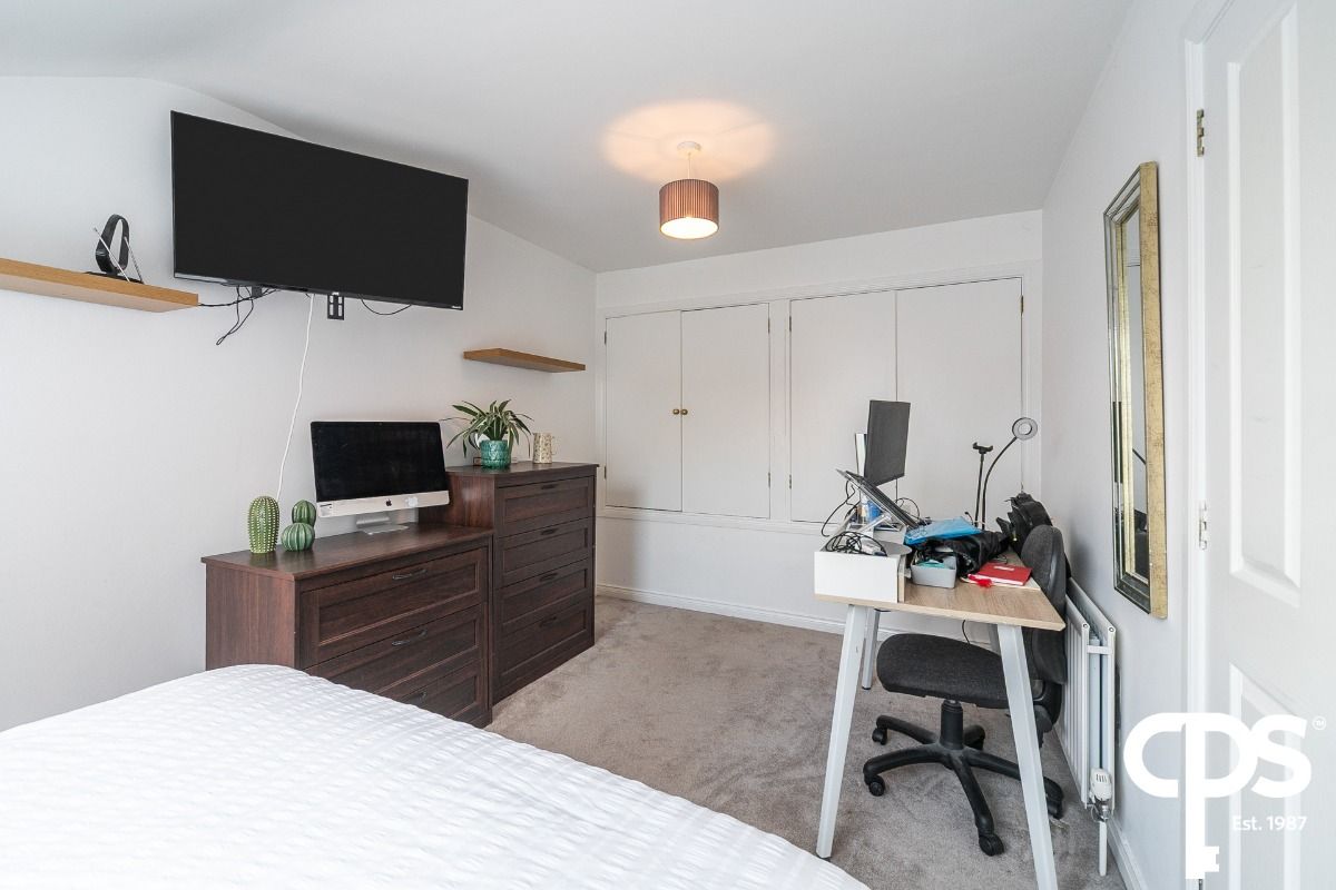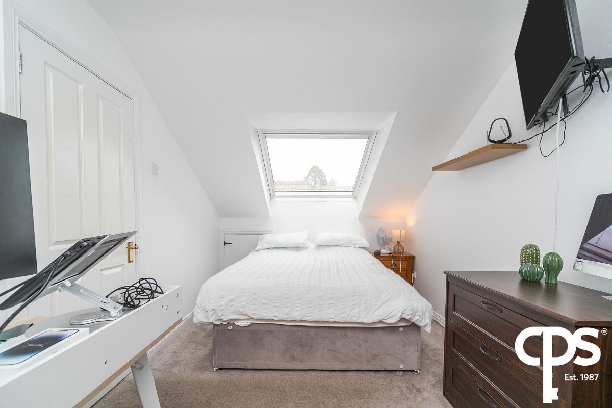 Grey carpet, double radiator, Velux window, integrated storage cupboards.