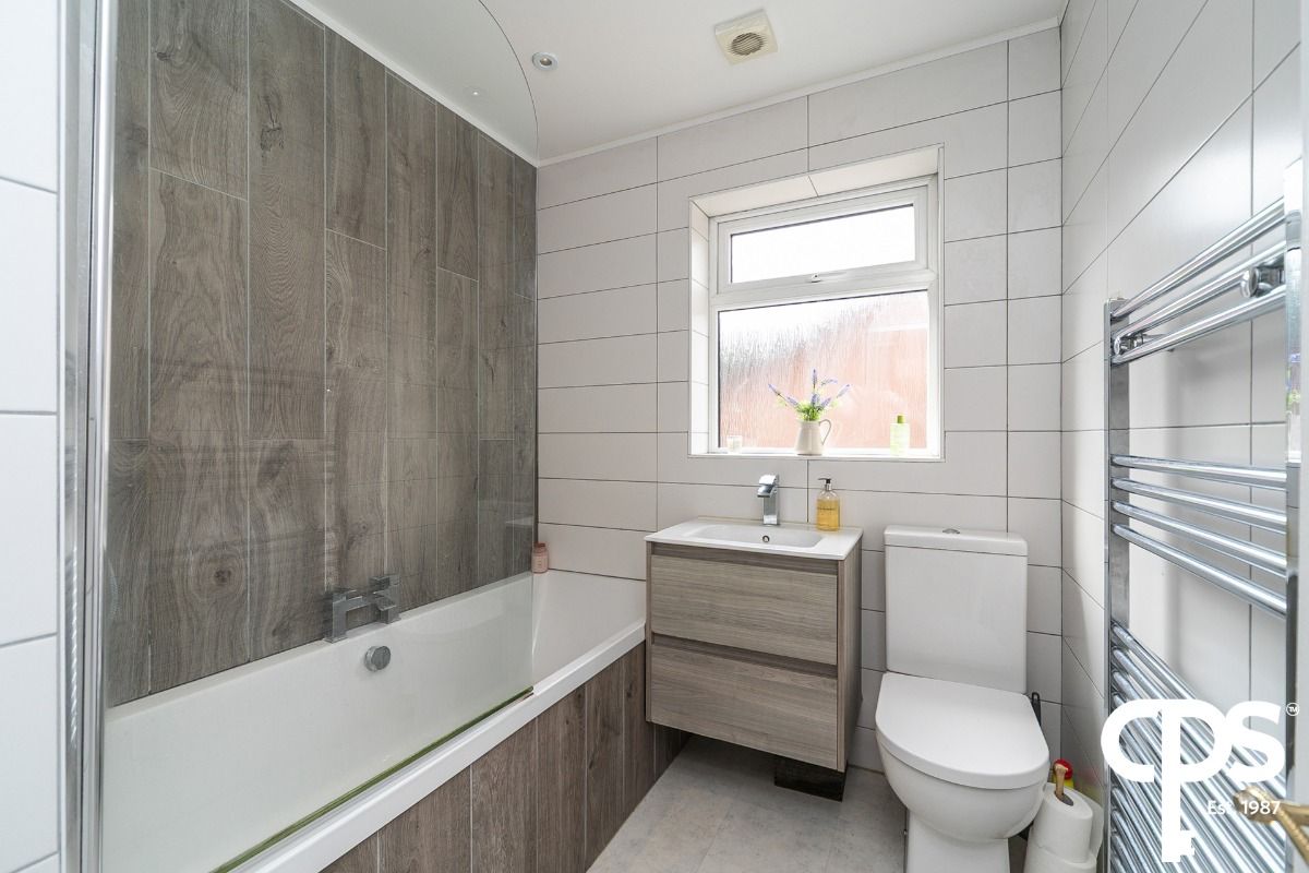 Tile flooring, fitted panel path with shower screen, chrome effect mixer taps, chrome effect shower, floor to ceiling wall tiles with wood effect feature bath panelling, wall hung wood effect vanity unit with wash hand basin and chrome mixer taps, low flush WC, chrome effect towel heater, spotlights, extractor fan.