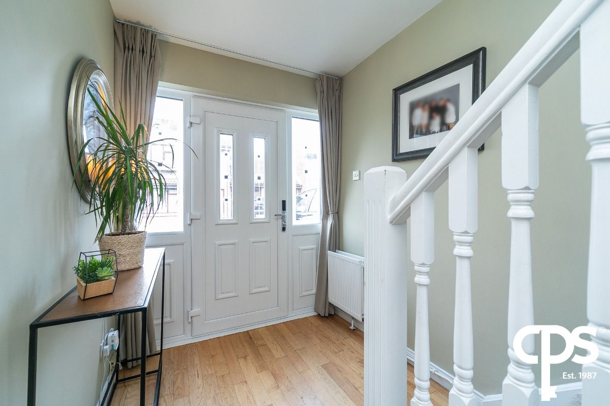 Feature block paving driveway, artificial grass lawn, outdoor double socket, garage door, PVC front door leading to;