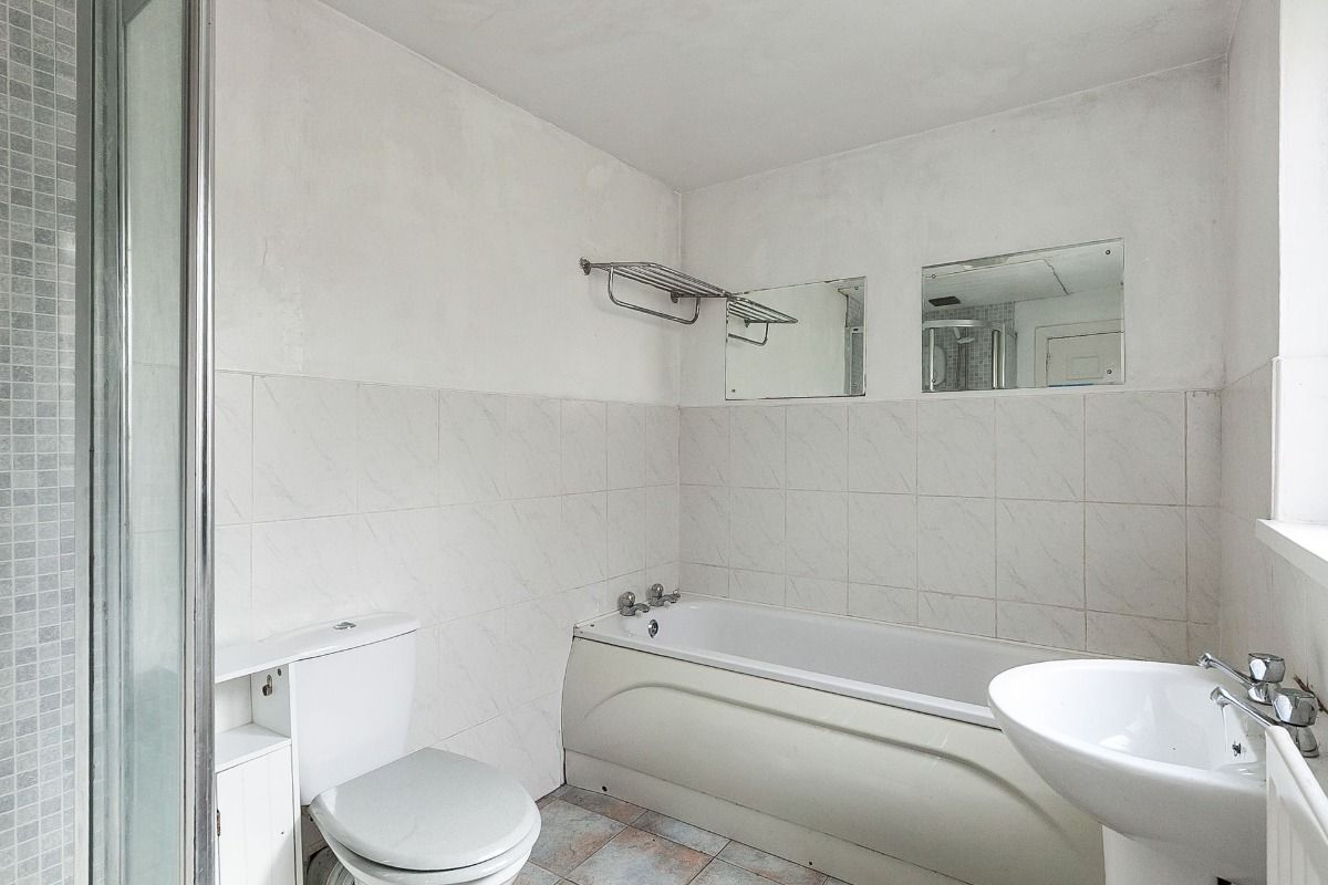 Family bathroom with four-piece white suite including bath tub, corner shower, toilet and sink. Bathroom is finished with tiled flooring and surround for a fresh look.