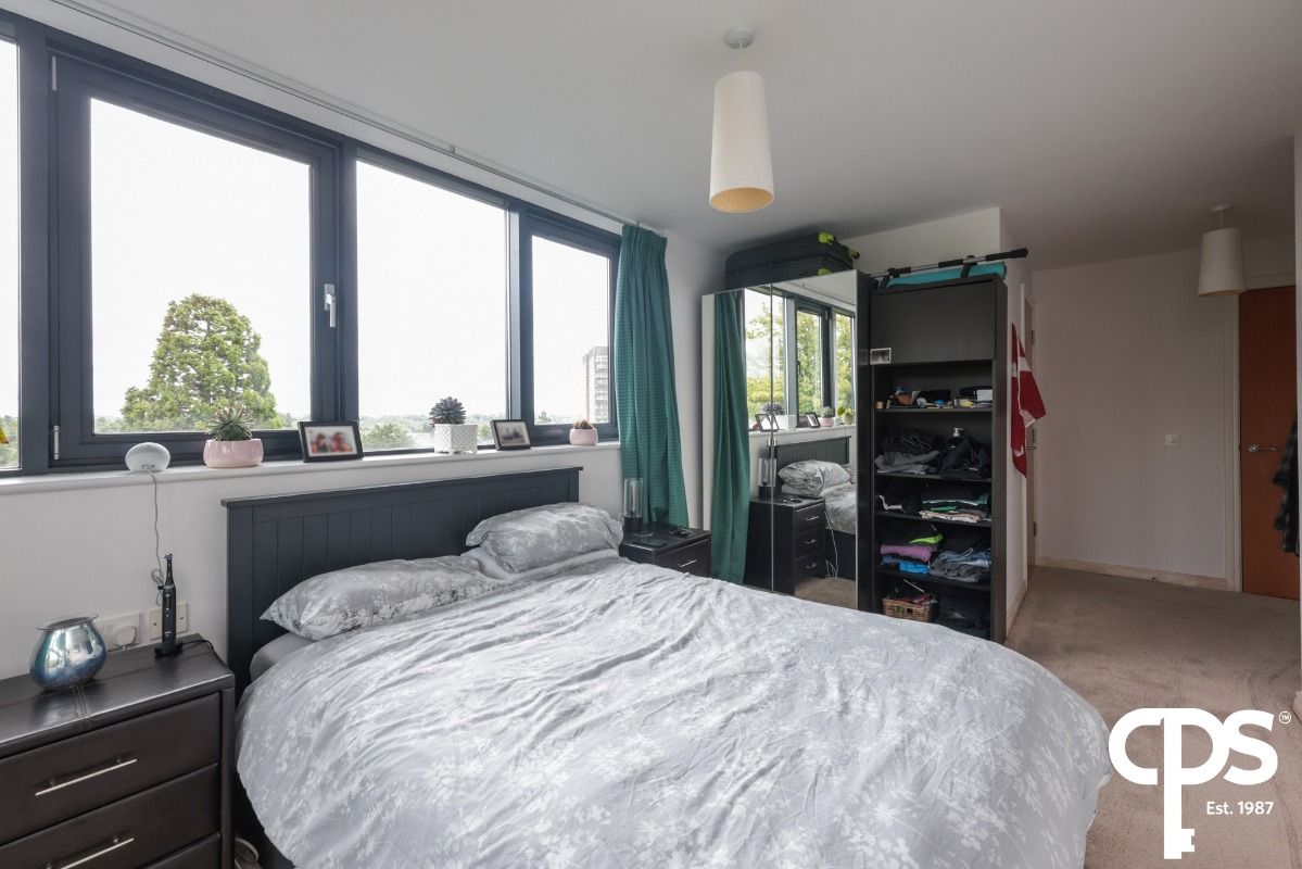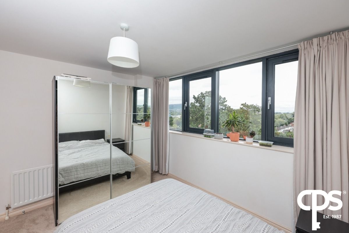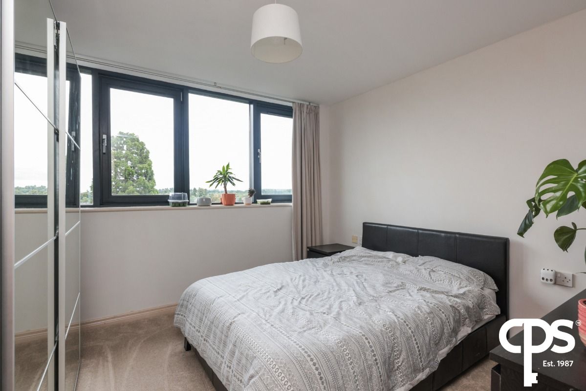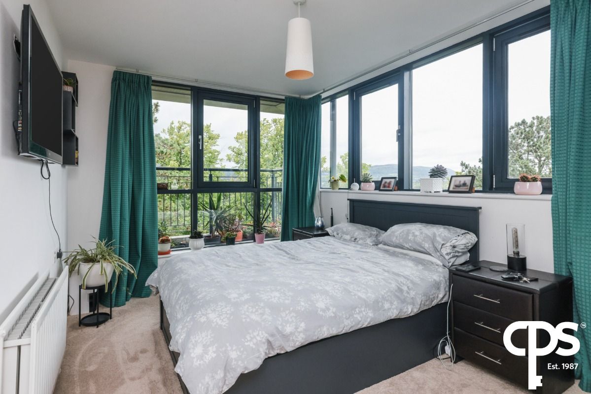 A spacious and light-filled double room with wrap-around windows. This bedroom benefits from carpet flooring and a private ensuite with a white three-piece suite comprising a corner shower, sink, and WC.